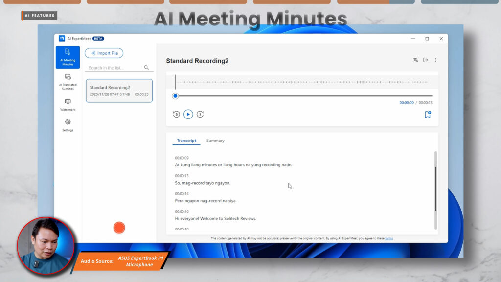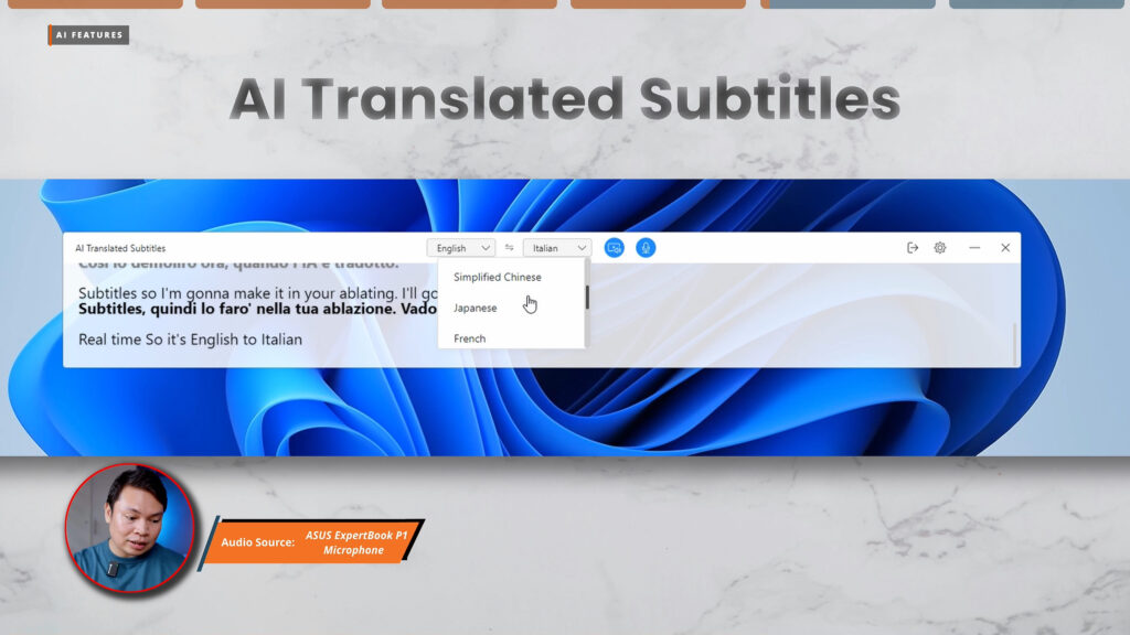 Una ang AI Translated Subtitles, habang nagsasalita ako ay nagta-translate na ito real time. Pwedeng baguhin yung language na ita-translate nito. Sinabi naman ng ASUS na madadagdagan pa yung mga languages sa mga future updates. Kapag may kausap tayo na iba ang language ay pwede natin itong gamitin.