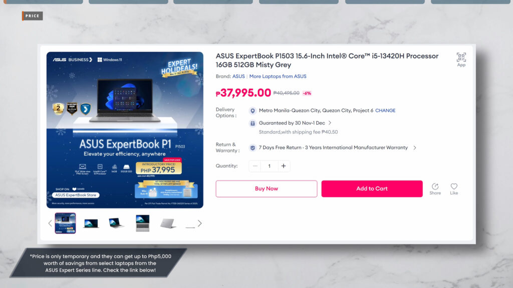 Dalawa ang size nitong ExpertBook P1, 15″ at 14″. Humabol na kayo kasi hanggang December 31 yung promo na yan ng ASUS. Kaya masasabi talaga na itong ASUS ExpertBook P1 ay for “budget-conscious professionals who require essentials without compromise.” Iyan ang sabi ng ASUS. Pero mapapatunayan naman natin kung accurate yan.