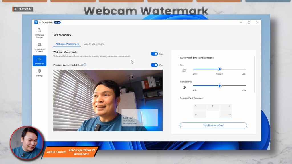 Huli, ang Webcam Watermark. Makakapaglagay ng watermark sa webcam nitong laptop. Malaking tulong yan, parang may suot tayo na ID habang meeting.