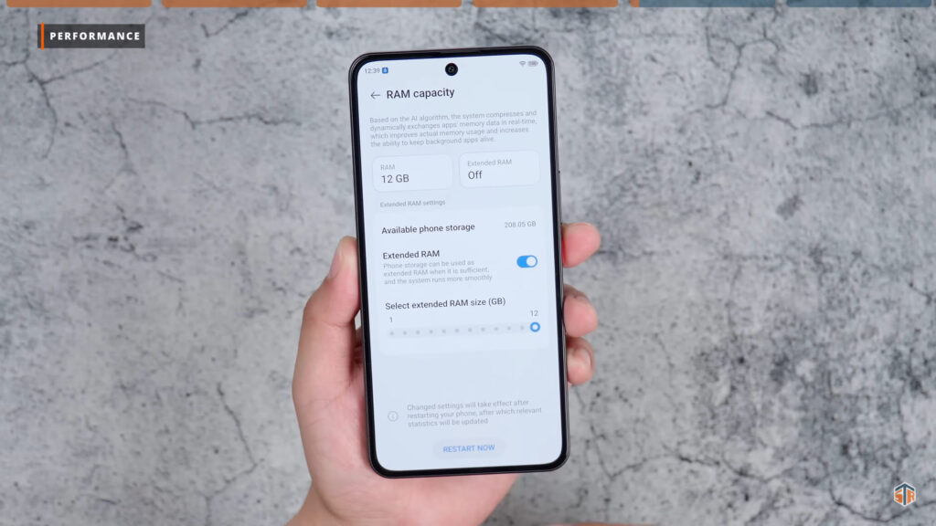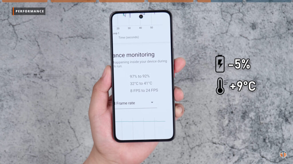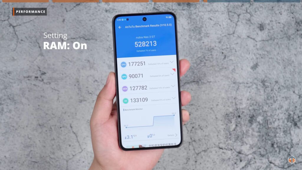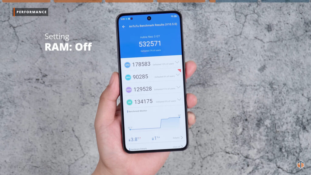 Meron itong tinatawag na extended RAM. Kapag ini-on ay pwede hanggang 12GB. Ang AnTuTu score na nakuha kapag ginamit yung extended RAM ay 528213. Not bad, mataas talaga yan. Kapag naka-off, ang nakuha ay 532571. Tumaas yung score nung hindi ginamit yung extended RAM. Para sa akin, ang laki na talaga nung 12GB na physical RAM kaya hindi kailangan yung extended RAM. Pero if ever man na kailanganin, asahan na medyo maapektuhan yung performance. Pagdating sa thermals sa Wild Life Stress Test. Nadagdagan ito ng 9°C. Well, not bad. Expected na yan para sa ganitong chipset. Hindi naman sobrang alarming ‘yung nadagdag na temperature. Hinay-hinay pa rin para sure at para tumagal ‘yung phone. Pagdating naman sa battery consumption, nabawasan ito ng 5%.