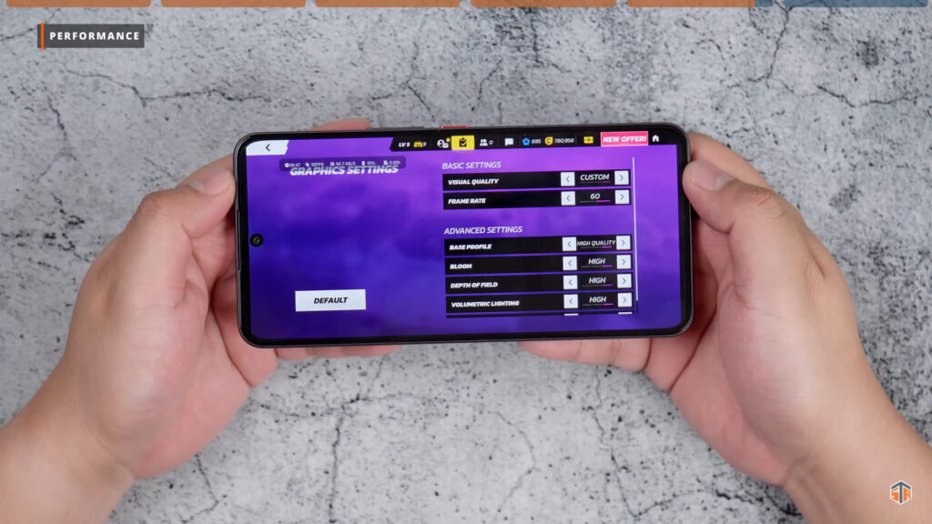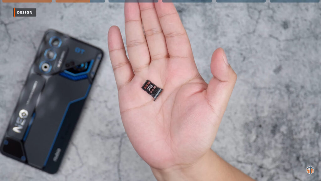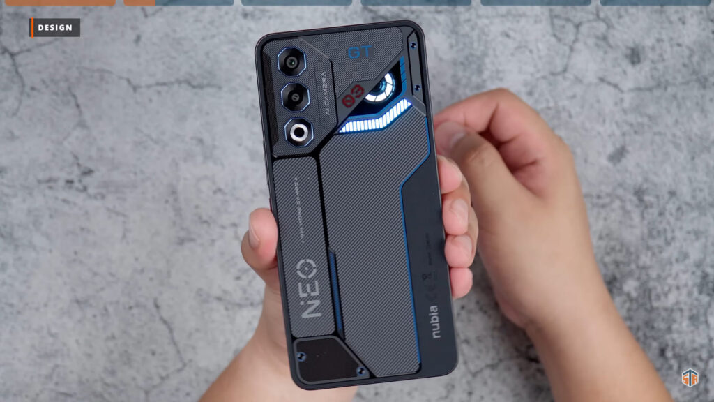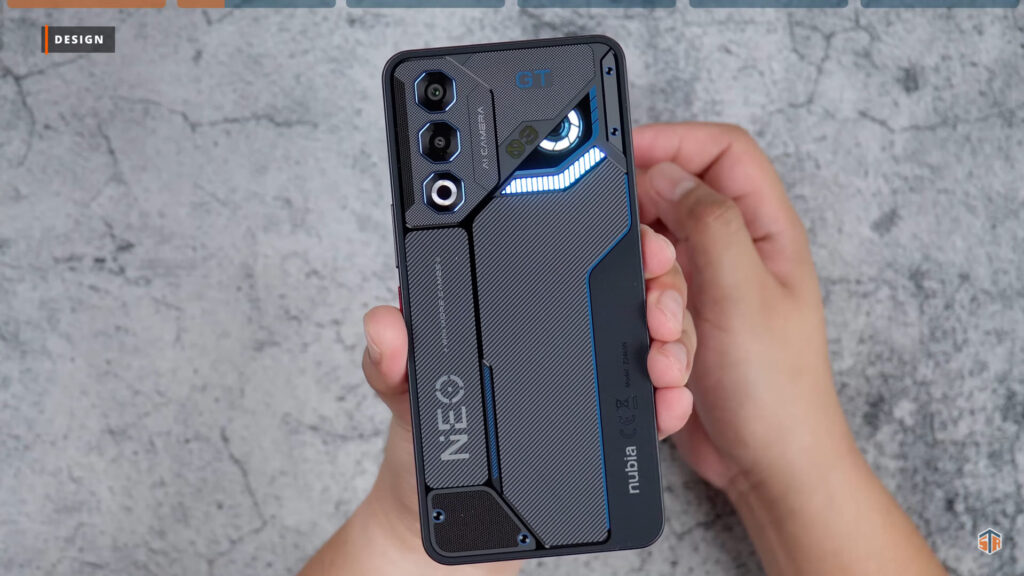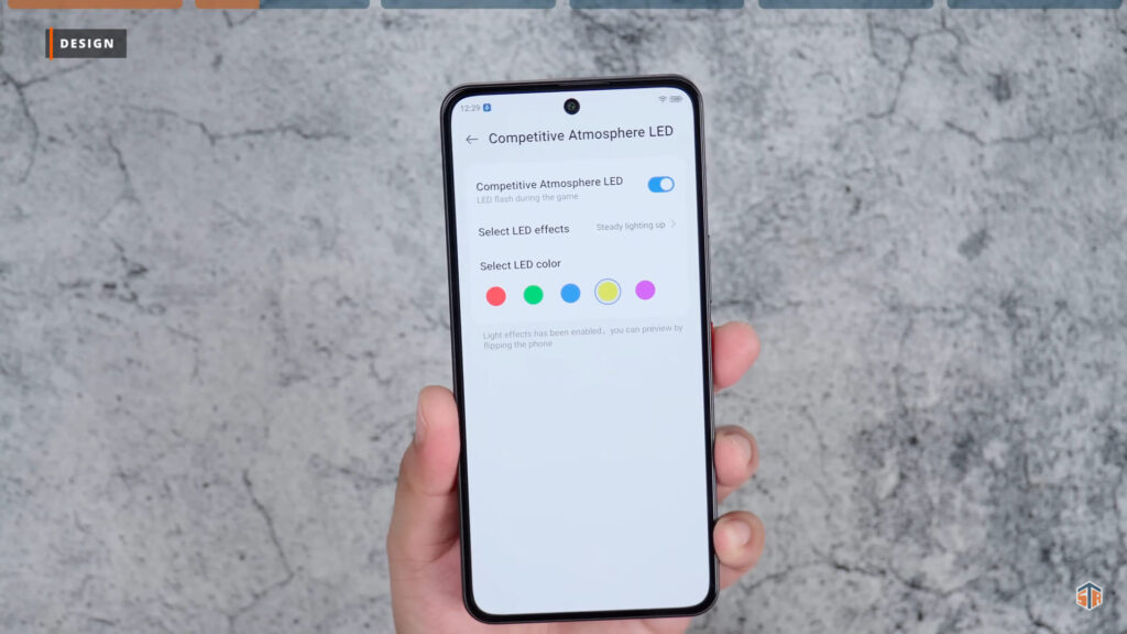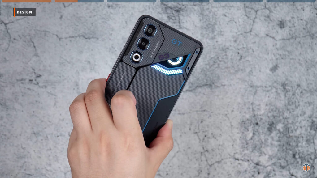 Yung likod nitong Neo 3 GT ay medyo glossy, kapitin ng smudges at ng fingerprints. Pero again, for the most part ay napakaganda ng design ng phone. May matte na mga parts tapos sa iba naman ay glossy. Yung parang mata, yung number three, tsaka yung guhit sa may ilalim ay umiilaw. Yung ilalim ay kulay blue ‘yung ilaw tapos ‘yung parang mata ay kulay white naman. Yang dalawa fix ‘yung kulay. Pero yung number three sa may gilid ay pwedeng i-customize yung kulay. Pumunta sa theme and personalization sa settings. Tapos click lang ang light strip setting at marami nang pwedeng i-customize. Sa competitive atmosphere LED, pwede mamili ng ibat-ibang kulay. Hindi ganon kahalata yung ilaw pero sa personal ay medyo obvious ito.