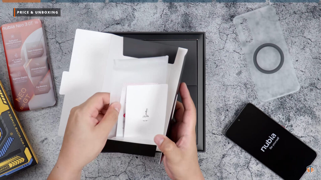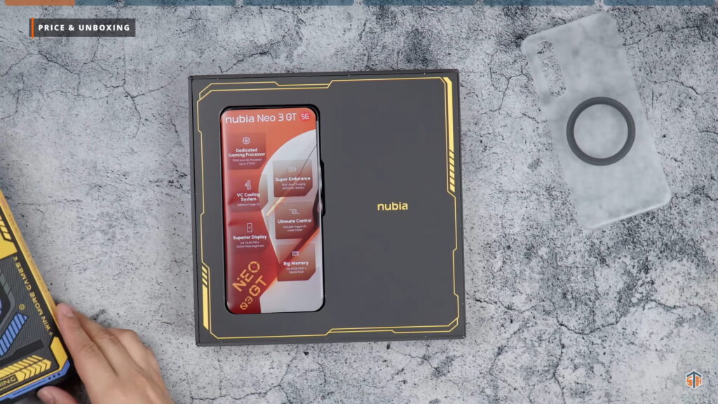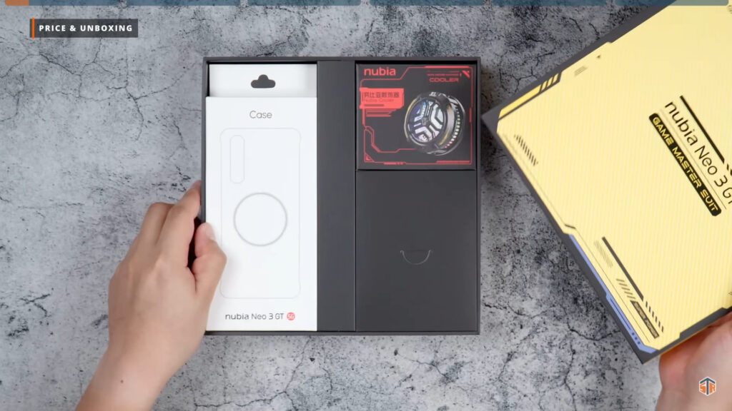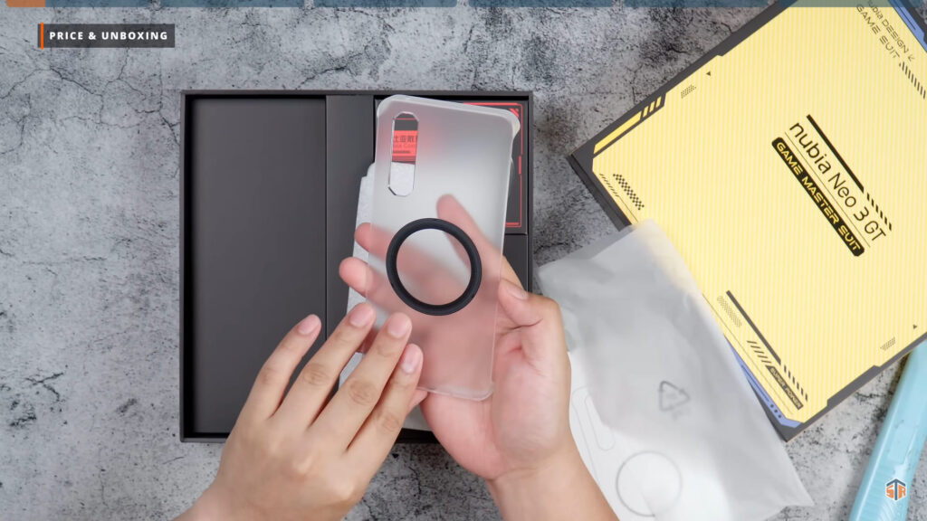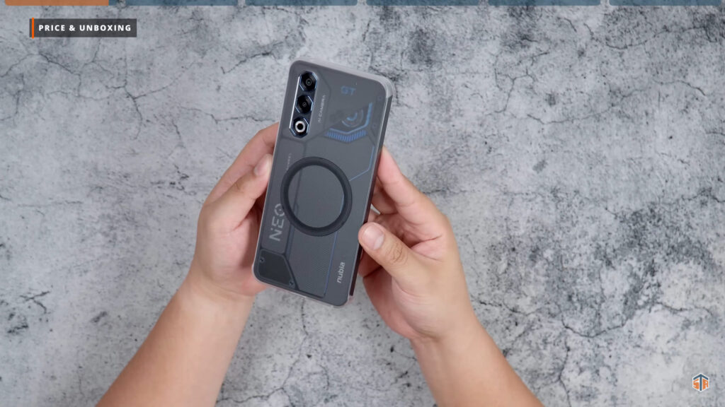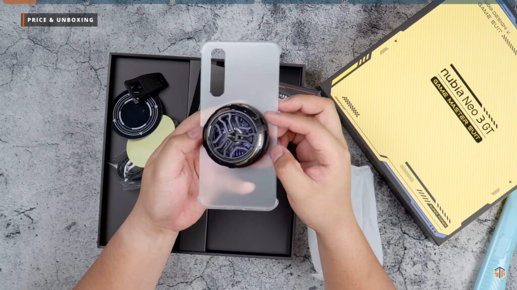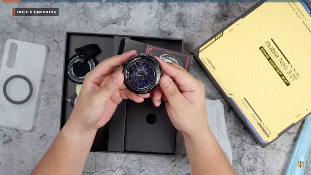 PR kit ng Neo 3 GT ang pinadala ng Nubia. Medyo kakaiba yung unboxing experience na ipapakita ko sa inyo. May dalawang box dito. Itong una ay yung mga accessories na pwedeng i-avail para sa Neo 3 GT. May case ito na almost same sa case na kasama sa mismong unit. Pero itong case ay merong magnetic ring sa likod. Walang wireless charging itong Neo 3 GT. Pero magagamit natin itong case sa next accessory na ipapakita ko. At yan ay yung nubia Magnetic Cooling Fan. Ididikit lang ito sa likod ng case. Hindi na kailangan pang i-clip or i-align para lang magamit. Idikit lang at comfortable nang gamitin.