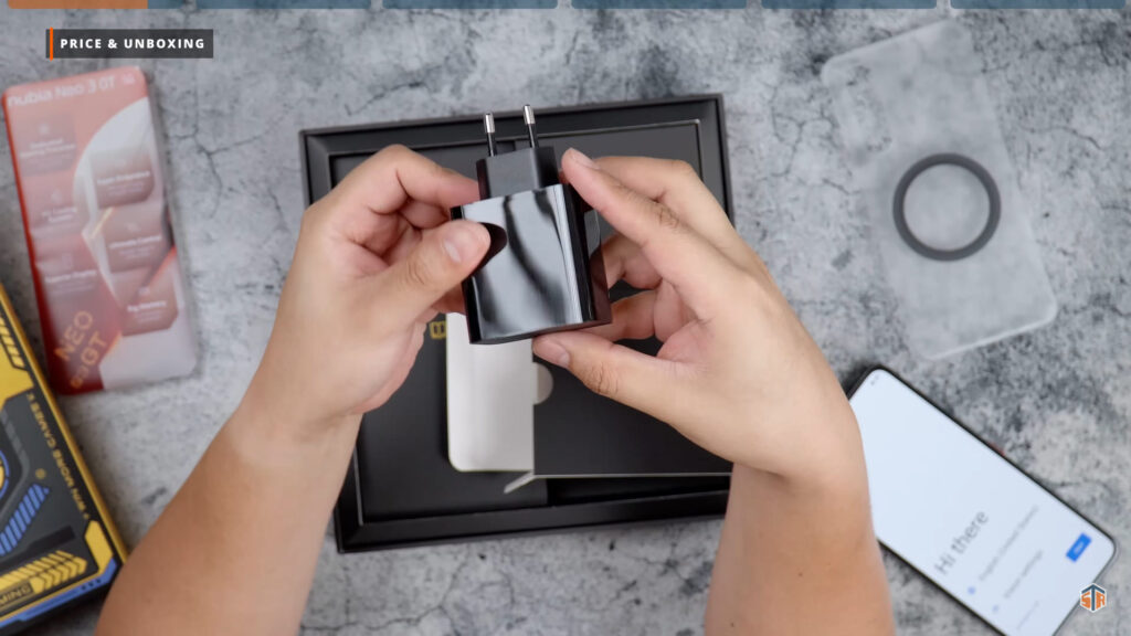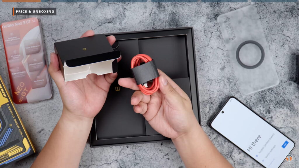 Sunod ang mismong box ng Neo 3 GT. Hindi ko sure kung ganito rin yung itsura ng box kapag bumili kayo nung actual unit. Nandito itong Interstellar Gray na colorway na 12/256GB. Pag-open, ‘yung phone agad ‘yung makikita na nakabalot sa isang printed plastic. Mecha ‘yung design ng Neo 3 GT sa likod. Sobrang linis pa rin ng itsura kahit maraming guhit-guhit or design sa likod. Nagandahan talaga ako. Meron din itong document sleeve na mayroong SIM ejector pin, manual, at case. Ang dalawang maliit na box ay yung 80W na charger na USB-C port at kulay red na USB-C cable. Kapag nilagay yung magnetic case sa Neo 3 GT ay medyo frosted pero kita pa rin yung design sa likod. Itong Neo 3 GT ay merong dalawang colorway, mayroon pang isa na Electro Yellow.