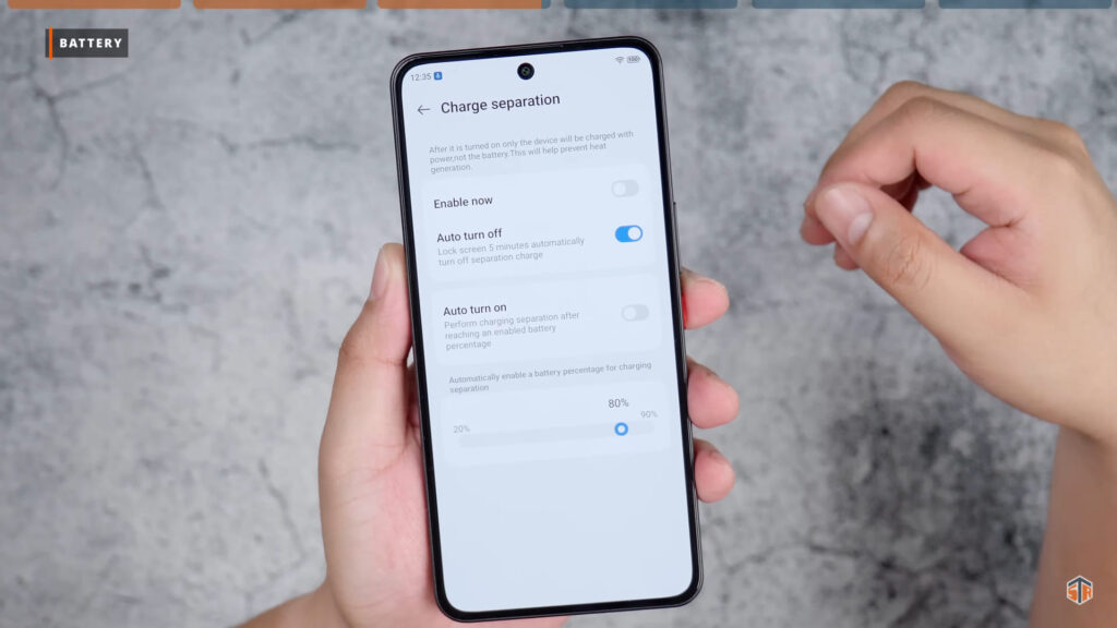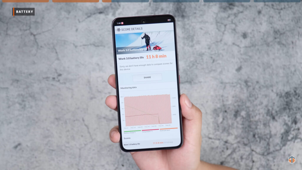 Nakuha sa PC Mark na SoT ay 11 hours and 8 minutes. Sa totoo lang, hindi ako na-impressed sa SoT kasi AMOLED na ‘yung display at ang laki nung battery capacity. Para sa akin ay maliit itong SOT. Sana sa mga susunod na software updates ay ma-improve pa yung battery performance. Sana makakuha ito ng at least 14 hours of screen on time. Pagdating sa charging, from 19% to 100% ay 1 hour and 7 minutes ko ito na-charge. Ang maganda rito, meron itong Charge Separation or Bypass Charging sa ibang mga phone. Makakaiwas sa pag-init habang ginagamit while charging.