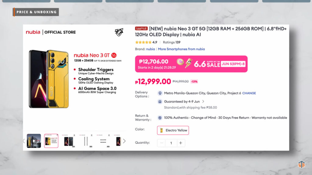 Pag-uusapan natin ngayon itong bagong nubia Neo 3 GT 5G. As of writing this article, ang presyo nito sa Lazada ay Php12,999. Nasa baba ang link para sa updated pricing.