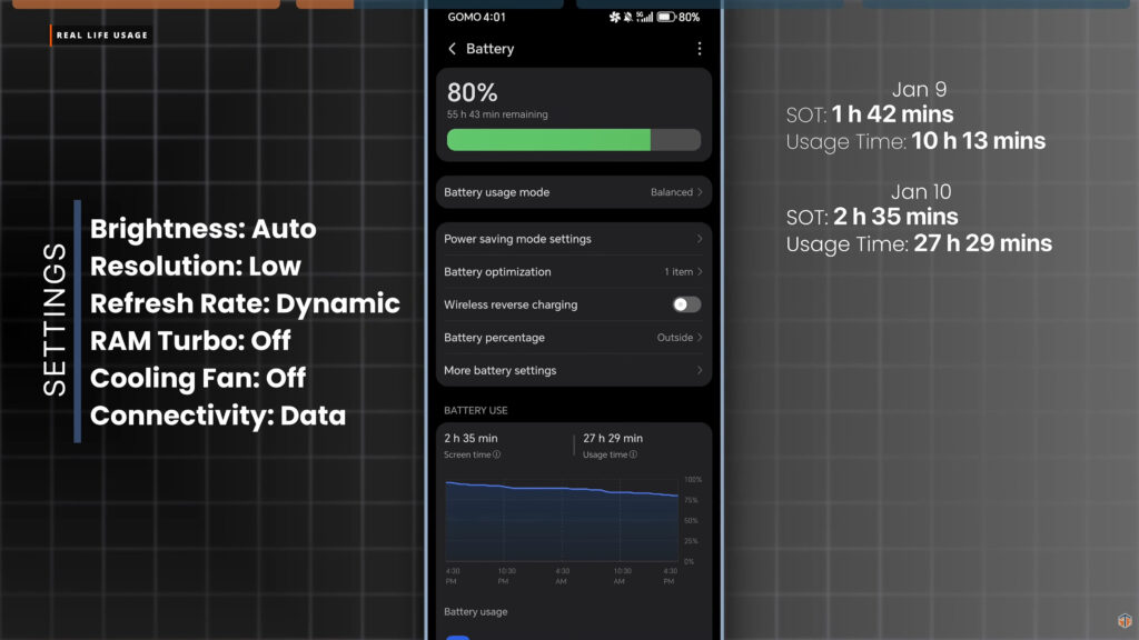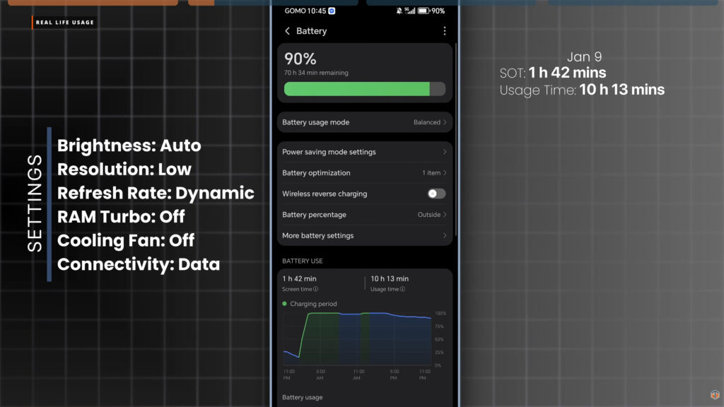Sa una, January 9 ng 10:45p.m. 90% pa rin ang natitira sa battery level. Ang SOT sa buong maghapon ay 1 hour and 42 minutes. Pero yung usage time ay 10 hours and 13 minutes. At reminder lang, ibig sabihin ng usage time ay mula nung binunot natin sa charger itong phone. Pangalawa, January 10 ng 4:01p.m. 80% na lang yung battery level. Yung SOT naman natin ay naging 2 hours and 35 minutes na. Yung usage time ay 27 hours and 29 minutes. Sa pangalawang screenshot na ito, mahigit isang araw ko nang ginagamit itong phone. Pangatlo, January 11. Kinabukasan ito ng 11:42p.m. Nag-screenshot ulit ako. 55% na lang ang natitira sa battery. Ang SOT na nito ay 4 hours and 38 minutes. Ang usage time ay naging 59 hours and 9 minutes na.