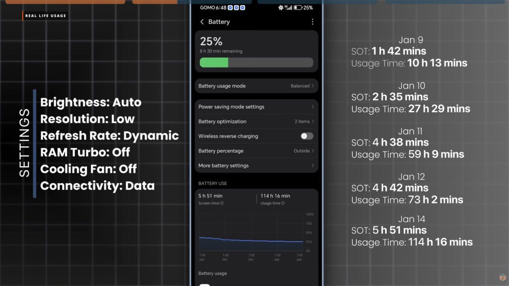Susunod naman ay January 12 ng 1:34 ng hapon. Nag-screenshot ulit ako. 50% na lang ‘yung natitira. Ang SOT nito ay 4 hours and 42 minutes. Hindi ko masyadong ginamit ‘yung phone nitong January 12. Ang usage time nito ay umabot na ng 73 hours and 2 minutes. Panghuli, January 14 na. Hindi ako nakapag-screenshot nung January 13. Pero hindi ko pa rin ito sinaksak sa charger. Noong, 6:48 p.m. ay 25% na lang ‘yung natitira sa battery. Ang SOT ay 5 hours and 51 minutes. Ang usage time ay 114 hours and 16 minutes.