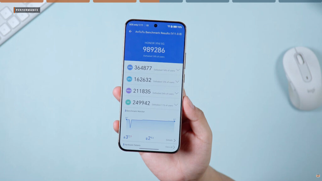 Ang maganda pa, sa Wild Life Stress Test result. Hindi man lang nabawasan kahit 1% ‘yung battery after ng test. Impressive. Yung temperature naman, nadagdagan ito ng 9°C lang, which is good. According to HONOR, meron itong 29500mmsq vapor chamber. Ang laki niyan kung ikukumpara sa RedMagic 11 Pro. If I’m not mistaken, 13116mmsq lang yung vapor chamber non. Syempre, meron yung built-in fan. Itong X9d ay wala pero yung laki ng vapor chamber nito ay doble sa RedMagic 11 Pro. If ever na maglalaro tayo o magpapatakbo ng mabigat na game or application. Hindi agad-agad iinit itong phone.