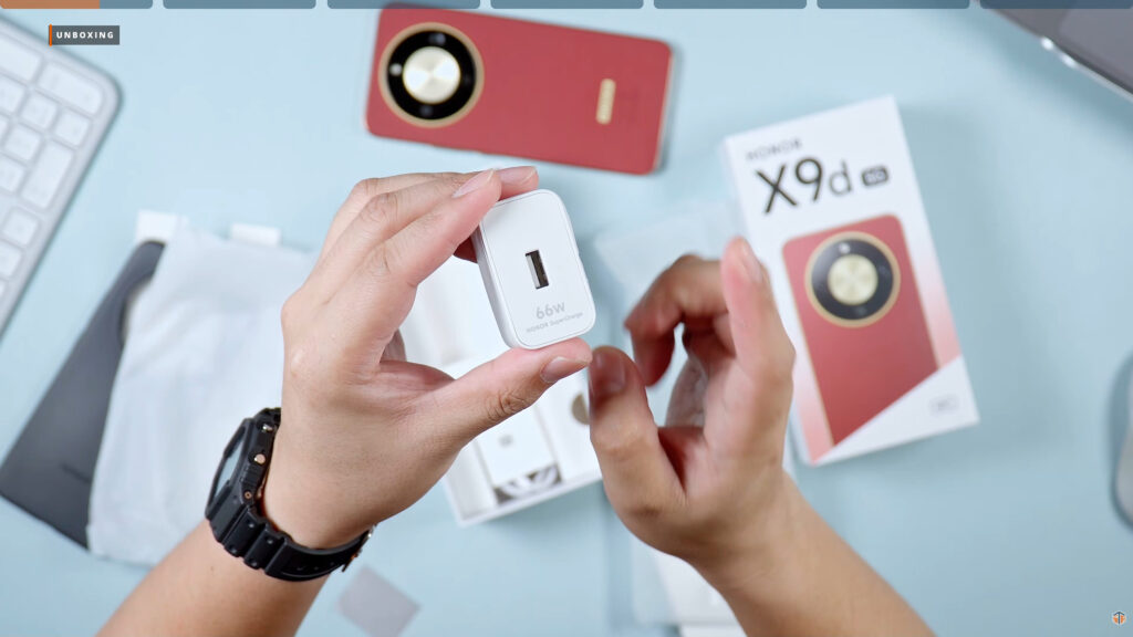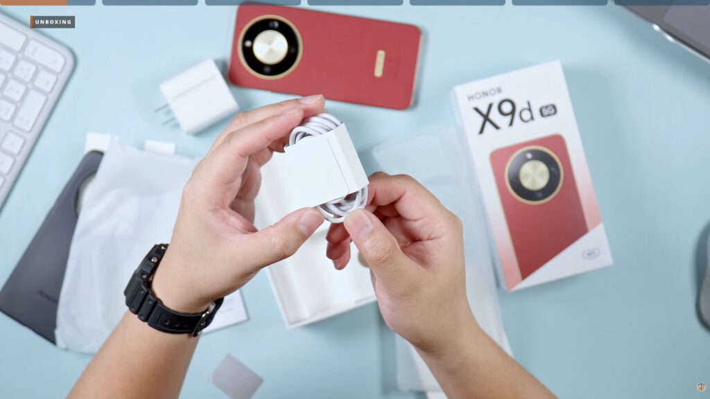 Makintab lang yung gilid nito. May mga smudges na agad. May pagka-leather yung texture nitong likod. Bilog ‘yung camera module nito. Hindi ito kapitin ng smudges o fingerprints kasi may pagka-leather yung texture nito. Meron na rin itong pre-installed screen protector. Sa ilalim ng box ay merong 66W charging brick na USB-A yung port and USB-C to USB-A cable. Na-test na rin nila sa store ‘yung charger nitong X9d kung nagcha-charge talaga. Ire-reset ko muna ‘to at mag-install ako ng mga apps and then kukuha ako ng ilang mga data. After 2 to 3 days. Ang ganda ng screen nito. Yung bezels nito ay manipis. Proportion sa buong sides. Sumisigaw ng premiumness itong phone.