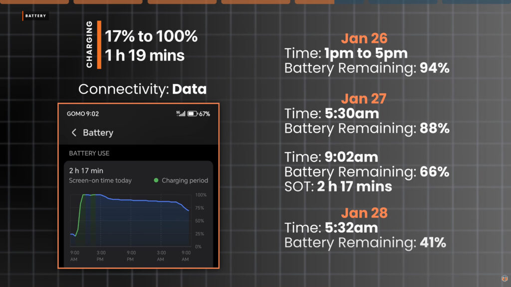 Pero kung inaakala ninyo na malaking SOT ang makukuha nitong HONOR X9d sa PCMark, hindi. Hindi man lang umabot ng 16 hours. Ine-expect ko talaga na aabot ito ng at least 19 hours of SOT. Hindi naman ganon ka powerful yung chipset nito na Snapdragon 6 Gen 4. Kaya in-expect ko na mataas yung SOT na makukuha nito. Pero hindi man lang umabot ng 16 hours. Sabi ng Honor na meron itong 3-day Battery Life. Gusto kong mapatunayan kung totoo ito.