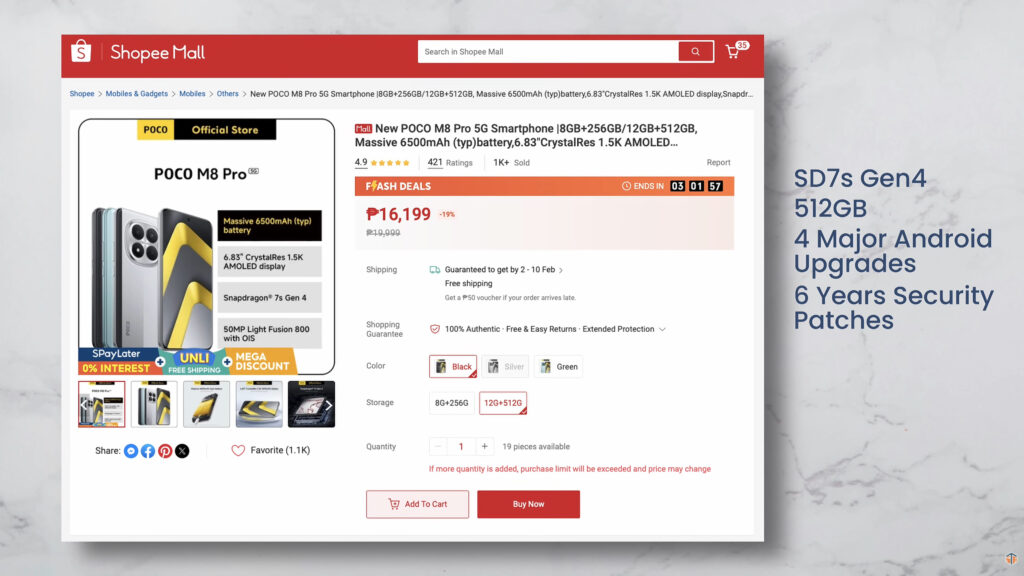 Ngayon, kung sakali man na gusto ninyo ng alternative. Number one, ang POCO M8 Pro. Php16,199 na lang ‘yung presyo niyan. Mas mura talaga kumpara sa HONOR X9d. Naka-Snapdragon 7s Gen 4 na yan. 512GB yung storage. 4 Major Android Upgrade at 6 Years Security Patches. ‘Di ba? Parang no brainer. Mas sulit ito.