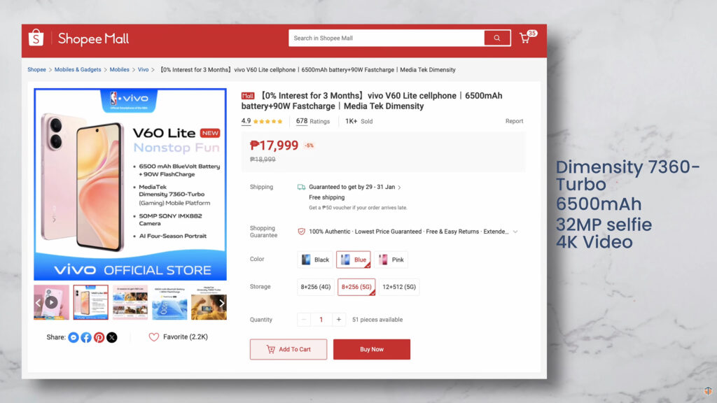 Pangalawa na option na gusto kong ibigay sa inyo ay ‘yung vivo V60 Lite 5G. Php17,999 pero less than Php1,000 pa rin compared sa HONOR X9d. Dimensity 7360 Turbo yung chipset. 6500mAh ang capacity, mas maliit pero siguradong mas mataas yung SOT nito. Military grade rin. Pero ito ang maganda, 32MP yung selfie camera at 4K video recording. Saktong-sakto for vlogging. Pagdating naman sa software support, 3 Major Android Upgrade ang matatanggap nito at 4 to 6 Years Security Patches.