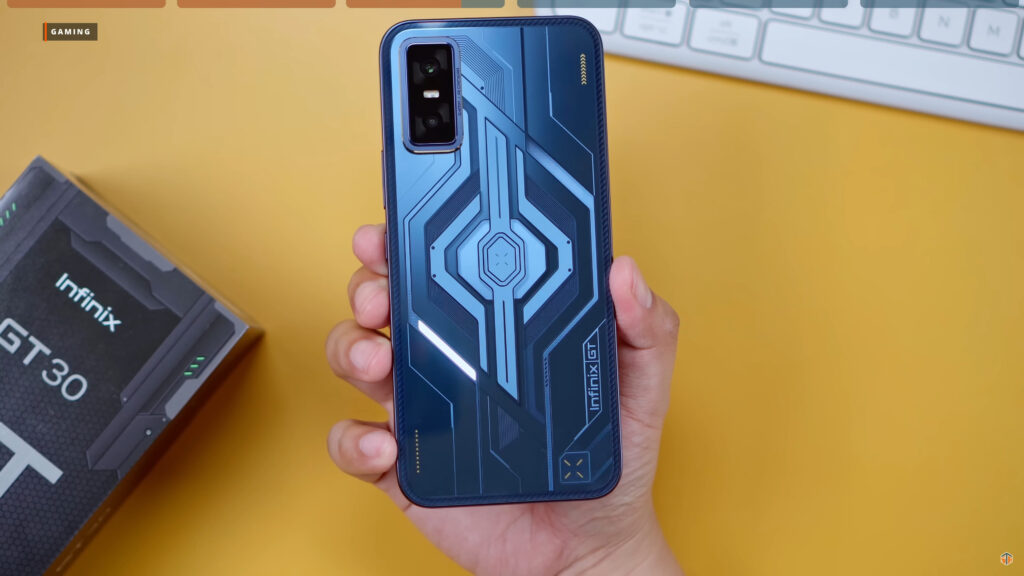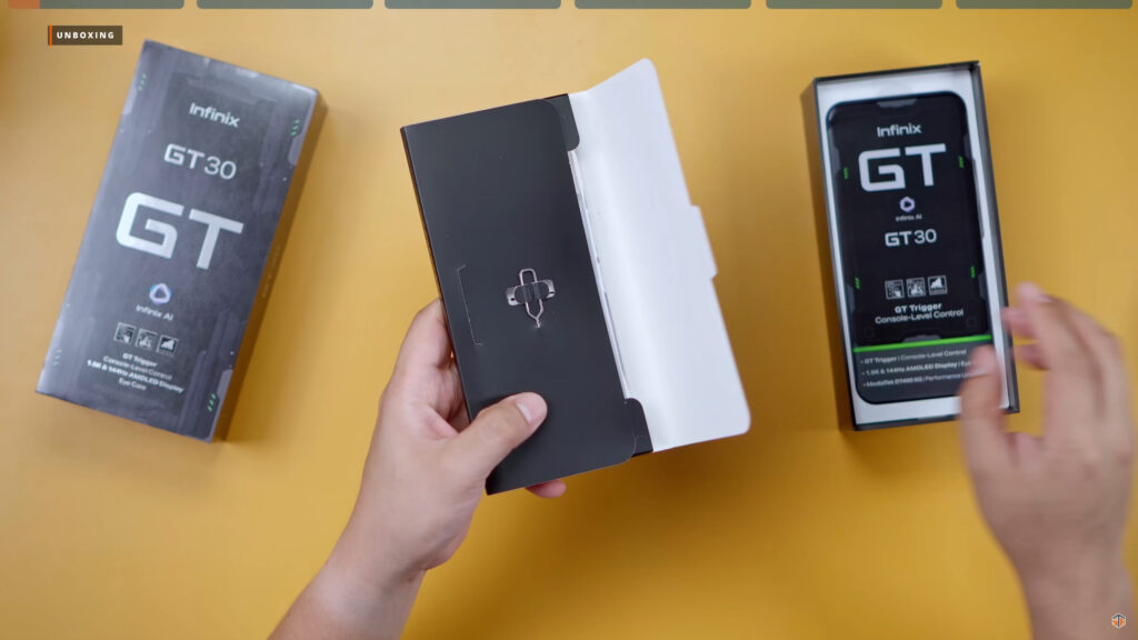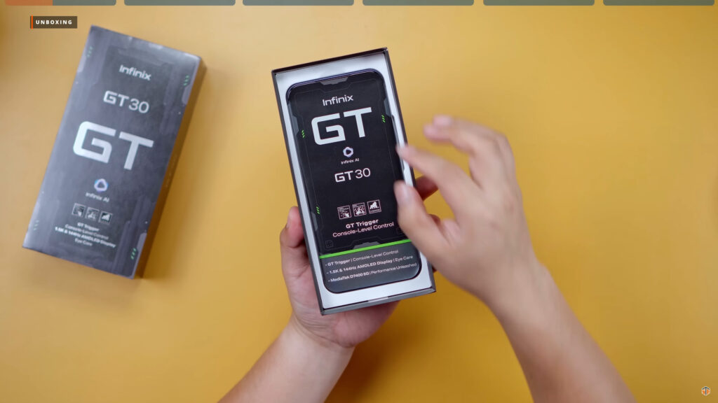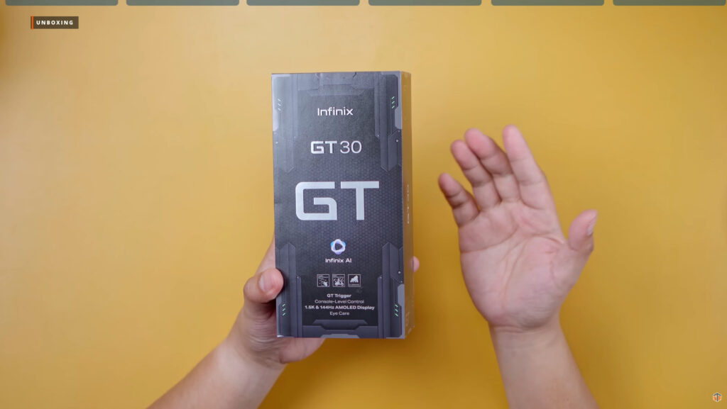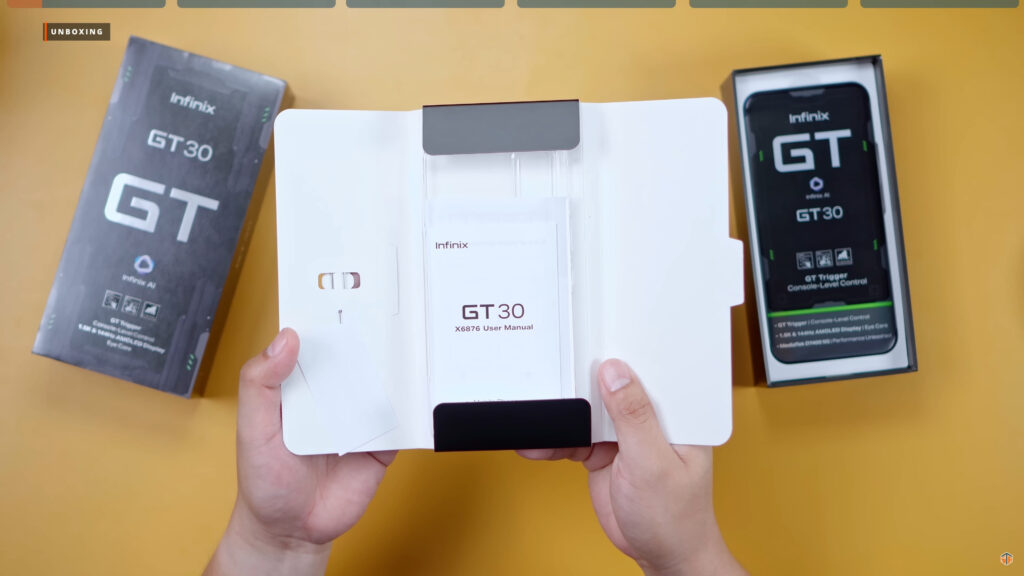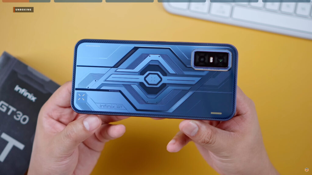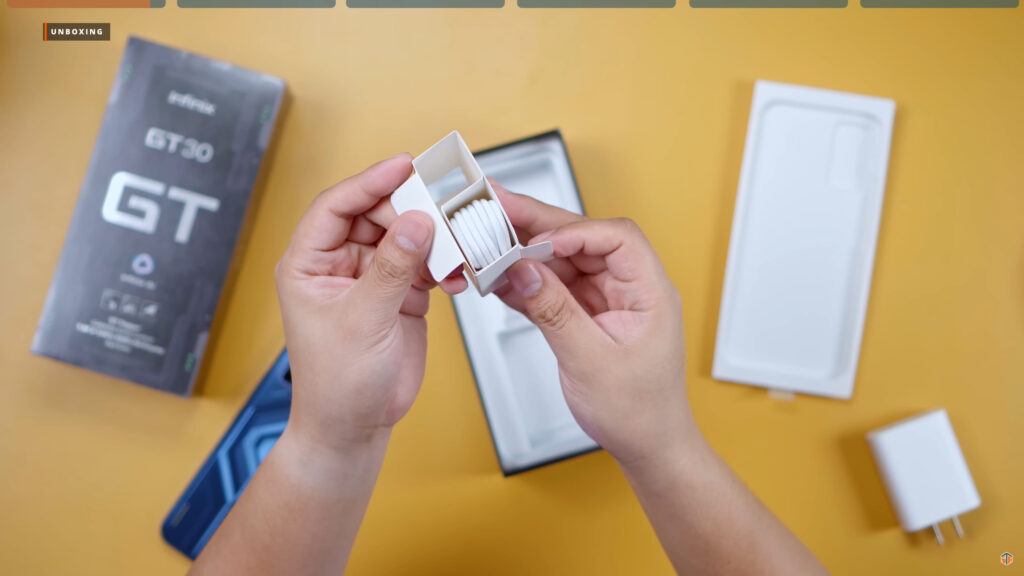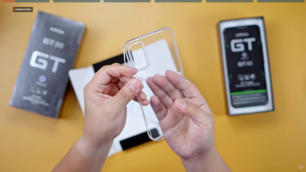 May pagka-gaming talaga sa box pa lang nitong Infinix GT 30. Merong top specs na makikita sa box. Pag-open ng box, yung document sleeve agad ang makikita. Sa loob ay may SIM ejector pin, documentation, at jelly case. Medyo makapal-kapal naman ang case pero clear. Sobrang clear talaga at malaking tulong yan para ma-appreciate ang design ng phone. Meron itong added protection sa maliit na camera module. Sunod ay ang phone na nakabalot sa isang printed na balot. Meron itong top specs ulit. Cyber Blue ito at napakaganda talaga.