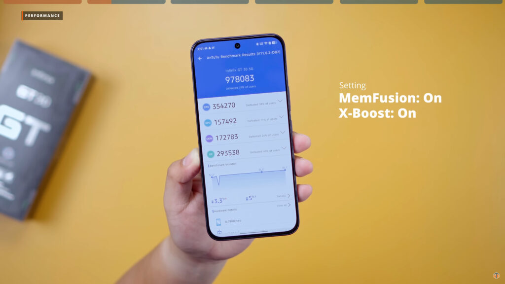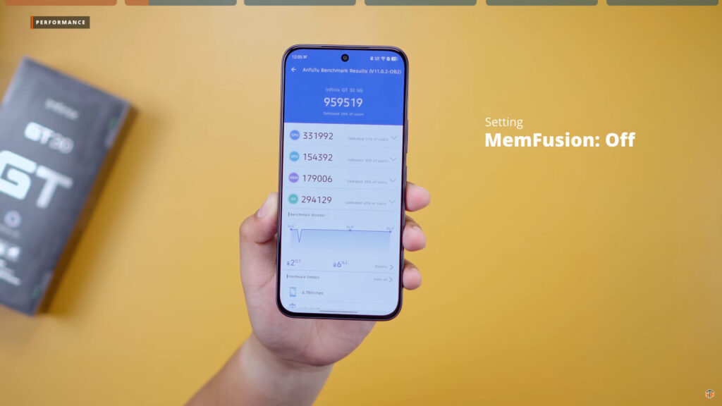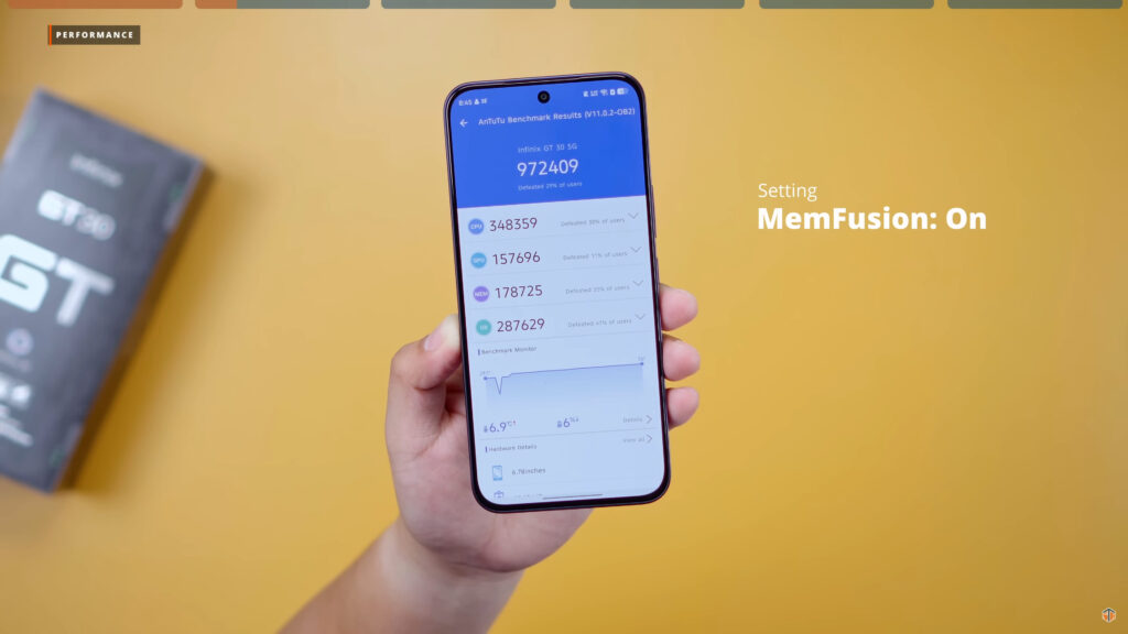 Pina-promise ng Infinix na itong GT 30 5G ay makakatanggap ng 2 Major Android Upgrades. At 3 Years Security Patches. Magandang promise na ‘yan para sa ganitong presyo at performance. Meron din itong MemFusion na up to 8GB. Technically, pwedeng maging 16GB ‘yung RAM. Ang AnTuTu score na nakuha sa Infinix GT 30 ay 959519. Iyan yung score kapag naka-off yung MemFusion. Kapag naka-on ang MemFusion ay 972409. Ang laki ng jump sa performance kapag ginamit yung MemFusion. Pero kapag naka-on yung MemFusion at naka-activate yung X-Boost, nag-jump ulit yung performance. Ang laki rin ng improvement, 978083. Talagang maganda yung performance na maibibigay ng phone kahit hindi sobrang mahal.