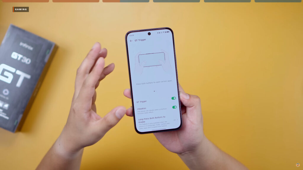 Itong GT Triggers ay capacitive. Flat na flat ito at walang physical button. May guhit ‘yung dalawang dulo nitong gilid ng GT 30. Para makita kung nasaan yung shoulder triggers. Itong shoulder triggers ng GT 30 ay merong 520Hz touch sampling rate. Napakabilis ng responsiveness nito kapag ginagamit. Console level itong triggers ng GT 30 5G dahil kasing ganda ng touch sampling rate nito yung REDMAGIC 10 Pro. Sa dedicated setting ng GT Trigger, madami pang pwedeng gawin sa GT Trigger. Halimbawa, i-long press yung parehas na triggers paraa buksan yung ibang application. Pwede ring i-double press yung isang GT Trigger para makapag-open ng isa pang application. At marami pang iba.