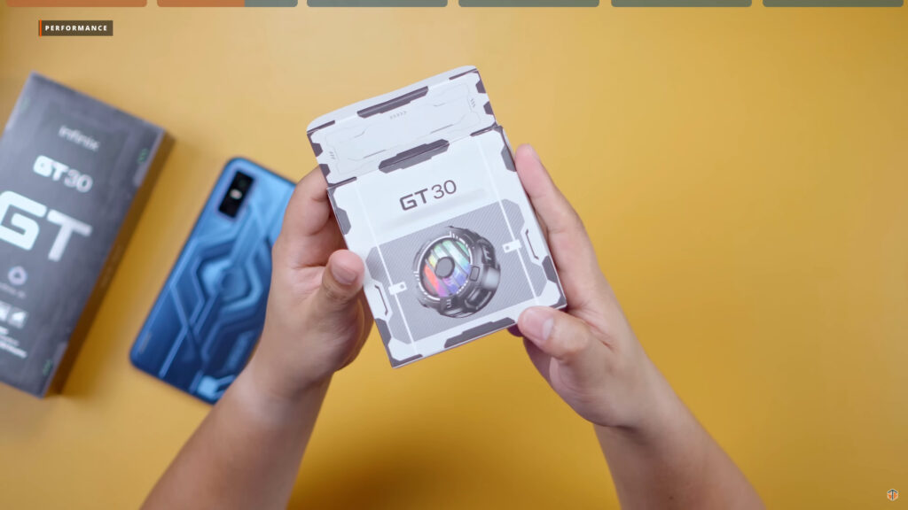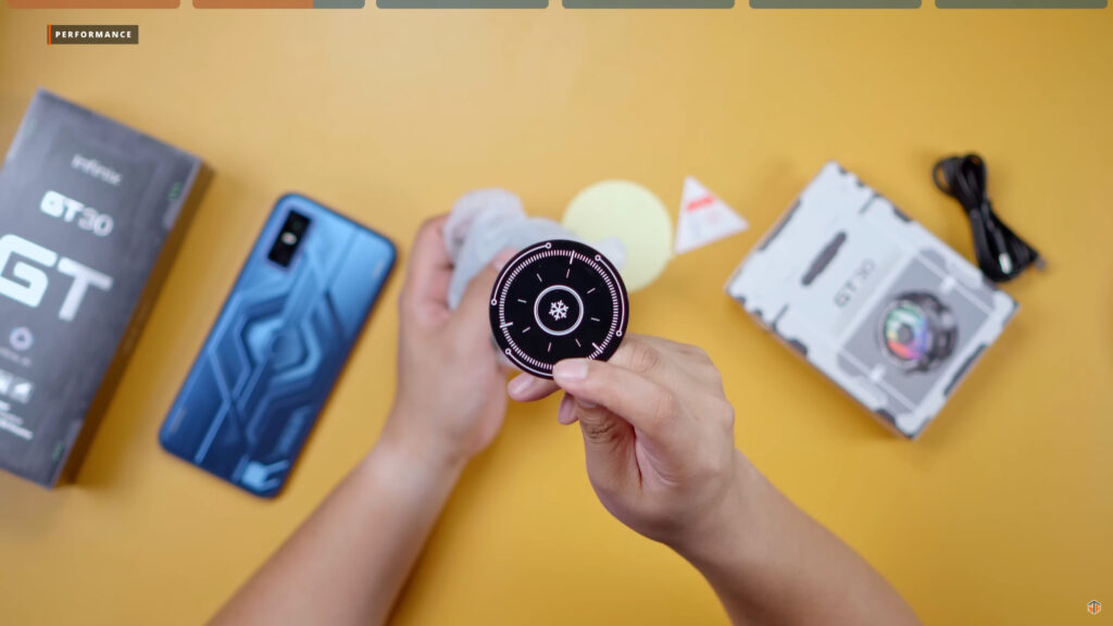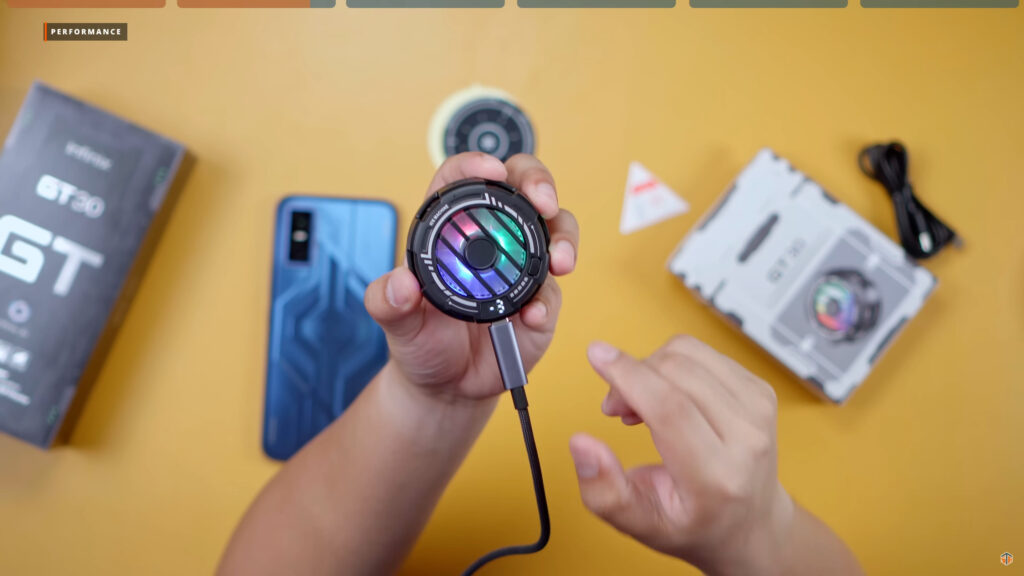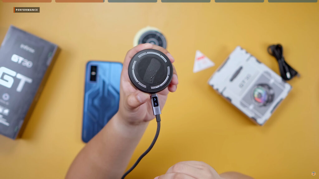 Merong accessories ito, ang MagCooling Fan. Pag-open ng box ay mayroon itong USB-C charger at ang MagCooling Fan. Ayan. Mayroong magnet na manipis na pwedeng idikit sa GT 30. O kaya ay ilagay lang sa jelly case sa loob para dumikit ang MagCooling Fan. By default, wala naman talagang magnet sa likod itong GT 30. Kapag sinasak ito sa charger ay meron itong RGB lighting. Merong button para ma-control yung level ng cooling na maibibigay. -3 yung pinakamalamig na pwedeng ibigay sa atin. ‘Yung likod nito ay nagmo-moist. Grabe dahil sobrang lamig talaga. Malaking tulong itong cooling system na ‘to.
