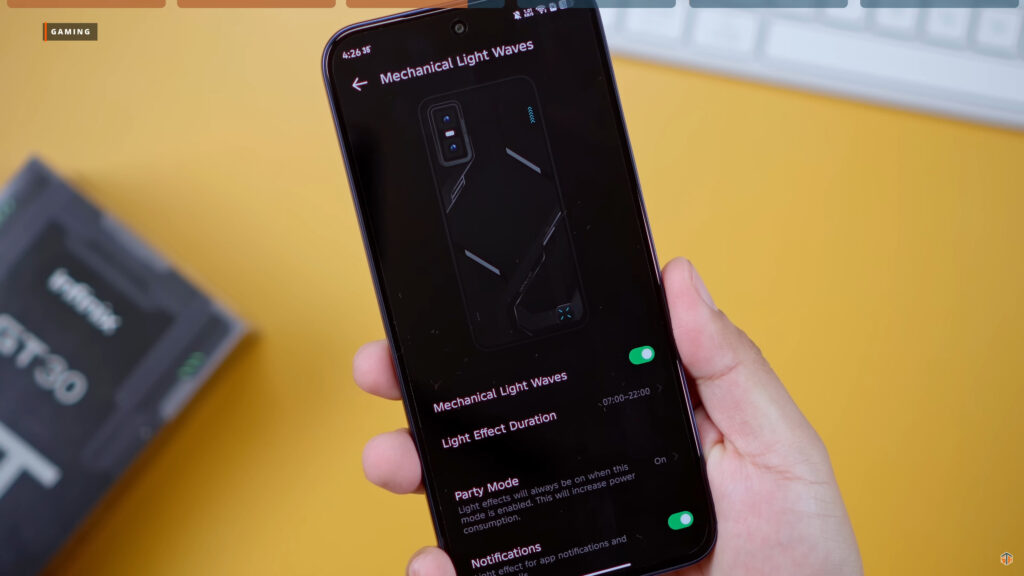 At for additional gaming effect, meron pa itong Mechanical Light Waves sa likod. Merong apat na ilaw na pwedeng i-customize. Sa settings ay makakapamili ng behavior ng Mechanical Light Wave sa likod. Meron itong IP64 na rating. If ever na matalsikan ng tubig, mabasa ng ulan ay walang problema. Huwag lang ilulubog sa tubig. Maganda yung haptics ng phone. Hindi ko ito ini-disable. Naka-JBL stereo speakers na rin ito. Nasa ilalim yung main speaker at yung secondary naman ay sa may taas. Malaki yung difference pagdating sa max volume.