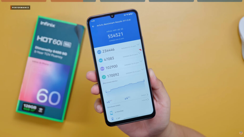 Meron itong MemFusion or Virtual RAM na up to 4GB. In total, pwede itong maging 8GB. Ang AnTuTu score ng phone ay 554521. Not bad para sa ganitong presyo. Kalahating million ang score na nakuha natin. At sa mga entry level phone na na-review natin this year. Nasa 200, 300, or 400 thousand lang yung AnTuTu score pero mas mahal kaysa sa HOT 60i 5G. Itong phone ay mura na pero lampas ang ibinigay na AnTuTu score. Napaka-decent ng magiging performance nito sa everyday na ginagawa natin. Pero pagdating sa gaming, hindi tayo mage-expect ng malaki sa phone kasi entry level lang ito. Casual gaming lang gaya ng Asphalt ay okay na okay ito. Hindi nito na-generate lahat ng graphics, as expected. Pero smooth ito at wala akong na-experience na lag or frame drops. Smooth lang pero yung graphics lang talaga ay compromise.