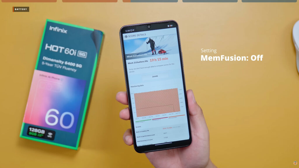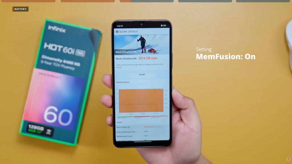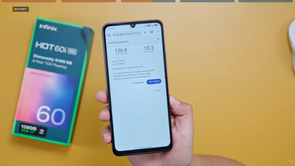 Malaki-laki yung battery capacity nito. Napaka-decent din ng SOT na nakuha nito, 19 hours and 15 minutes. Iyan ay kapag naka-off ang MemFusion. Kapag naka-on ang MemFusion nadagdagan ng kaunti ang SOT, 20 hours and 28 minutes. Para sa isang entry level phone ay napakaganda ng battery performance nitong HOT 60i. Good news iyan para sa mga nagpaplanong gamitin ito as backup phone. O kaya gagamitin ito sa work. Lalo na sa mga gumagamit ng GPS based apps like Waze at Google Maps. Sa buong maghapon ay hindi tayo bibitinin nito sa power.
