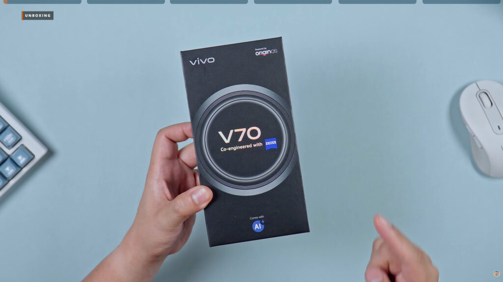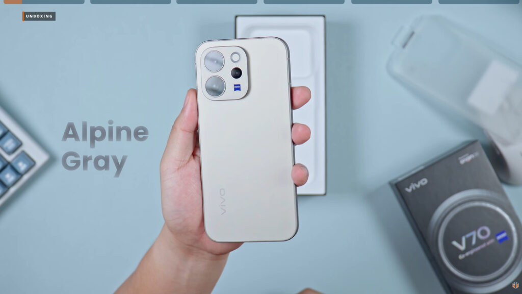 Wala namang masyadong kakaiba sa box ng V70. Same pa rin sa mga nagdaang V series ng vivo. May V70 sa harap, Comes with AI text sa may gilid, at Powered by OriginOS sa may taas. Pag-open, ang unang makikita ay yung mismong V70 na nakabalot sa plastic. Napaka-premium talaga ng itsura nitong Alpine Gray. Sa may ilalim ay walang kahit anong document sleeve. Diretso na agad sa case. Makapal yung transparent case nito. Pero hindi ako masyadong fan ng ganitong case.