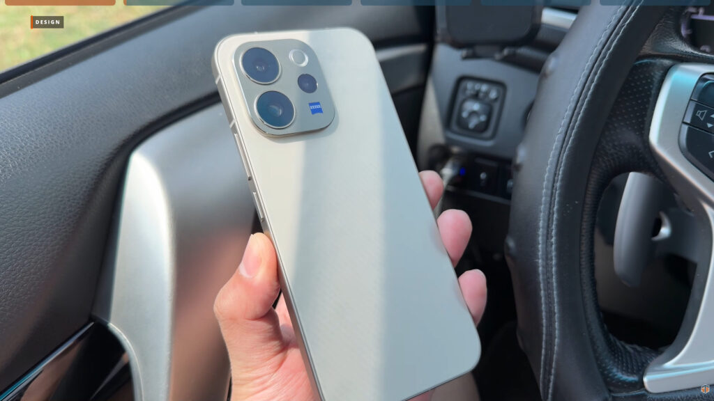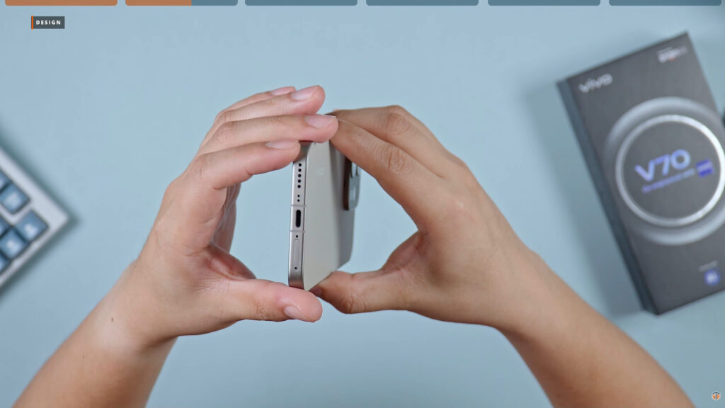 Again, sobrang premium ng itsura ng V70. Compared sa mga previous generation, mas mukha itong flagship. Yung likod ay matte finish pa rin. Nangingibabaw yung kulay nung camera module. Talagang masaya ako na hindi glossy yung design ng camera module. Unlike sa ibang brands ngayon na matte yung likod pero sa camera module ay makintab naman. Kaya magiging kapitin din ng smudges at ng fingerprints at alikabok. Pero sa V70, all the way protected yung phone from smudges. Meron itong ZEISS Optics. Yung gilid ay aluminum frame. Metallic yung camera module. Rounded yung corners kaya comfortable ito gamitin. Hindi masakit sa mga kanto-kanto. Meron din itong subtle na vivo branding sa may ibaba.