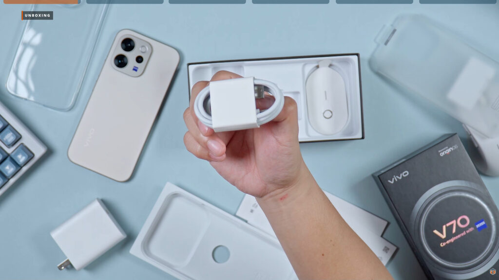 Sa totoo lang, thankful tayo na merong case sa loob ng box. Pero madami na kasing brands ngayon na may case na mas maganda. Kaysa sa mga transparent case na nakasanayan natin. May kulay, mas makapal, at mas maganda yung grip kaysa sa transparent case. Pero again, thankful tayo na meron. Kahit na nasa Php39,999 yung pinakamataas na presyo ng vivo V70 ay may case ito ay may additional protection sa camera module. Makapal naman ito for the most part. Good start para hindi tayo agad mapwersa na bumili ng third party case. Meron din itong documentations, charging brick na vivo FlashCharge 90W na USB-A pa rin yung port, USB to USB-C cable, at lastly yung SIM ejector pin.