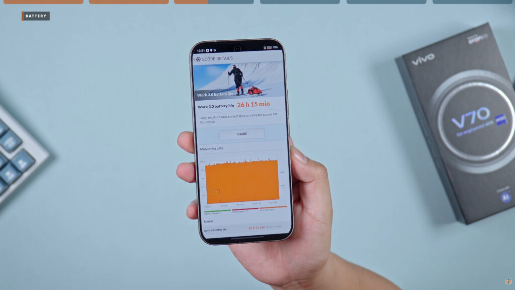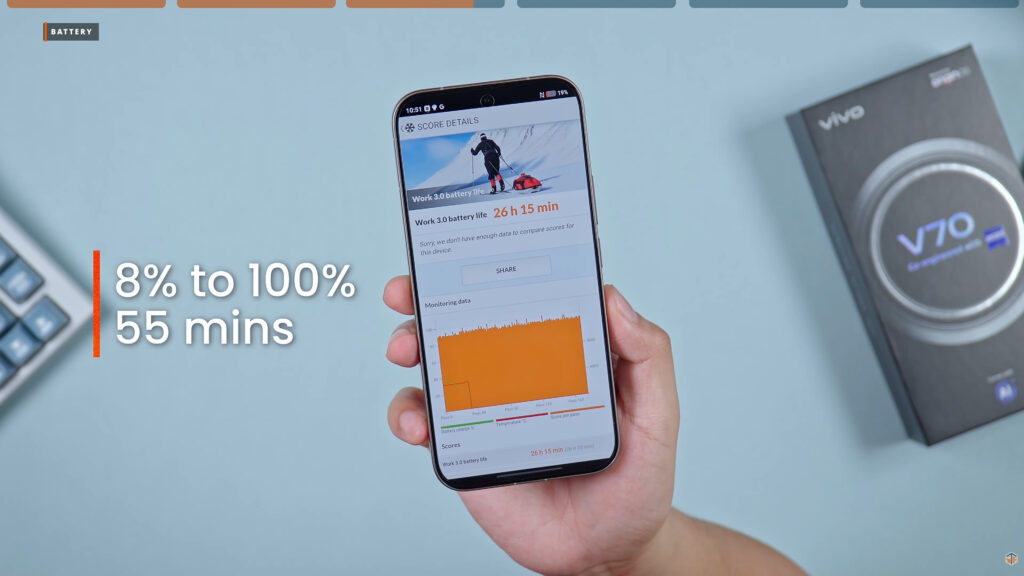 Kahit na manipis yung itsura ng phone, malaki yung battery capacity na nailagay ng vivo. Dahil yan sa BlueVolt Technology. Mas matagal ‘yung lifespan ng phone compared sa mga phones na walang ganitong technology. Kagaya dati, as expected, napakataas ng SOT na nakuha ng vivo V70. 26 hours and 15 minutes. Hindi biro yan. Napakaganda talaga and well optimized ng OriginOS. Take note lang, nung ini-test ko yung phone ay naka-set ito sa pinakamataas na resolution. Which is yung UHD at naka-High yung refresh rate. At ang taas pa rin ng SOT na nakuha nito. Imagine kung pinakamababang resolution yung naka-select at hindi naka-auto lang ang refresh rate. Baka umabot ito ng 30 hours. Abangan sa Facebook page ng Sulit Tech Reviews kung ano yung magiging result kapag pinakamababang resolution ‘yung ini-set at nag-PC Mark tayo ulit. Sa charging, 8% to 100%, 55 minutes ko lang na-charge itong phone.