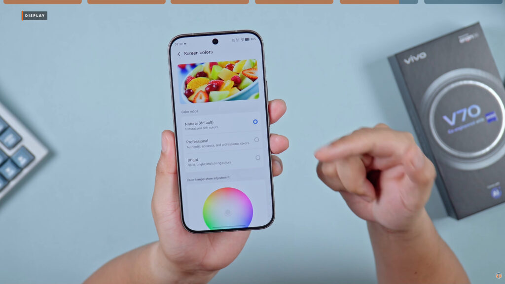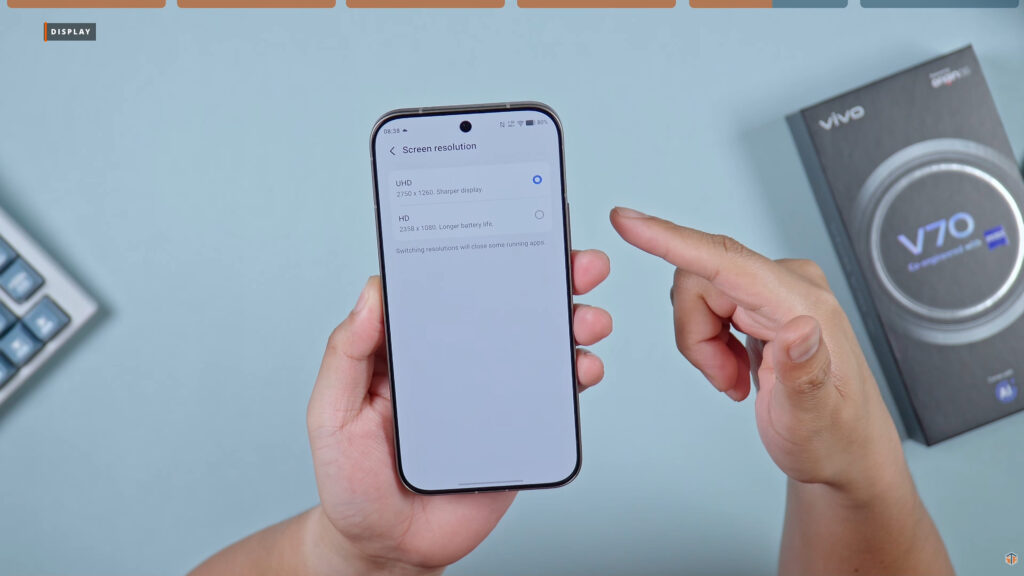 5000nits lang naman yung peak brightness nito. Talagang wala tayong problema kahit pa-outdoor natin gamitin yung phone na ‘to. Out of the box, may naka-install naman na screen protector. Maganda po talaga yung color production nito. Accurate yung kulay na makikita natin sa screen nito. Nababago ‘yung resolution nitong vivo V70. Sa display settings, hanapin niyo lang yung screen resolution. At kapag in-open yan, yung default ay 1260p pero pwedeng HD or 1080p lang para sa longer battery life. Pero sa 26 hours 15 minutes na SOT, UHD yung setting.
