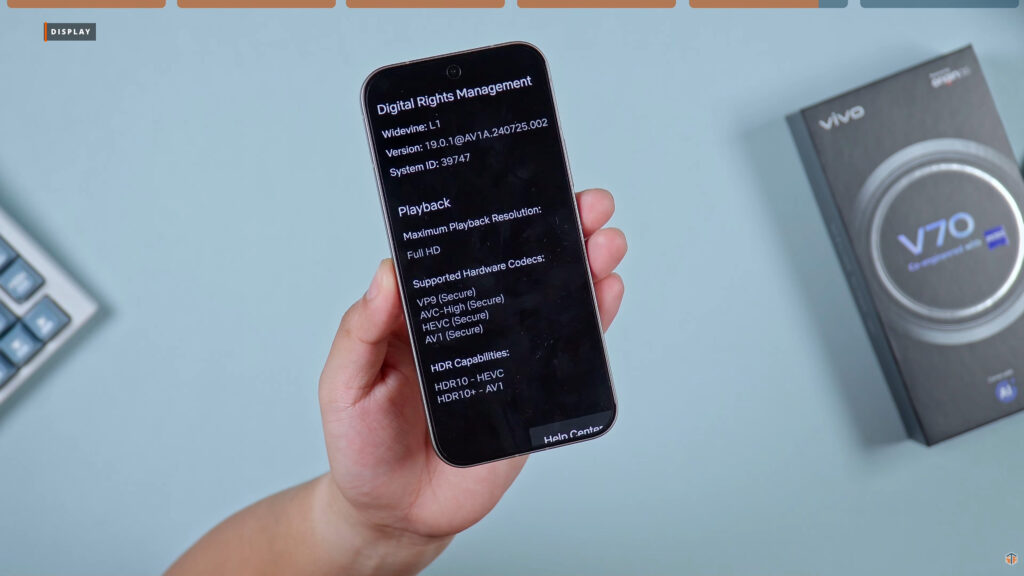 Sa refresh rate, ang options ay Smart, Standard, at High. Tatlo rin yung option para sa kulay. Merong Natural, Professional, at Bright. Good news kasi yung Widevine Security nito ay Level 1. Full HD yung max playback resolution sa Netflix. Plus, meron pa itong HDR10 at HDR10+ support. Again, hindi lang sa design mukhang flagship itong vivo V70. Pati na rin sa camera performance at sa display.