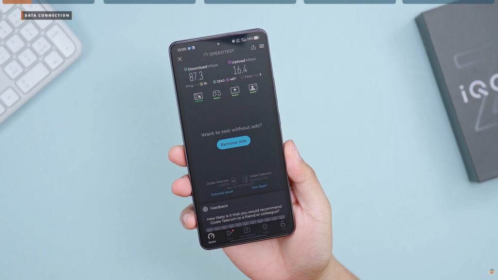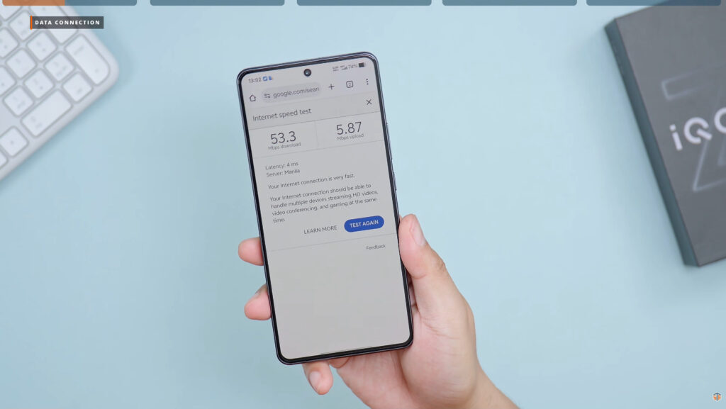 Kagaya ng sinabi ko sa unboxing at first impressions, itong iQOO Z10 Turbo+ ay 4G+ lang yung pinakamataas na data connection na pwedeng masagap. Iyan ay kung Smart, Globe, or GOMO SIM yung gagamitin ninyo. Pero yung DITO SIM, sabi ng AHH’s Xiaomi Manila, 5G signal naman ‘yung masasagap non. Ang download at upload speed sa OOKLA speed test ay 87.3Mbps at 16.4Mbps naman yung upload. Sa Fast, 78Mbps at 22Mbps naman yung upload speed. Panghuli, sa Google speed test ay 53.3Mbps lang at 5.87Mbps upload speed.
