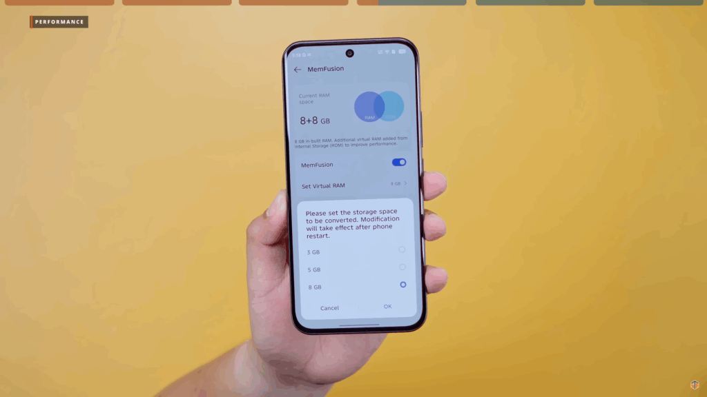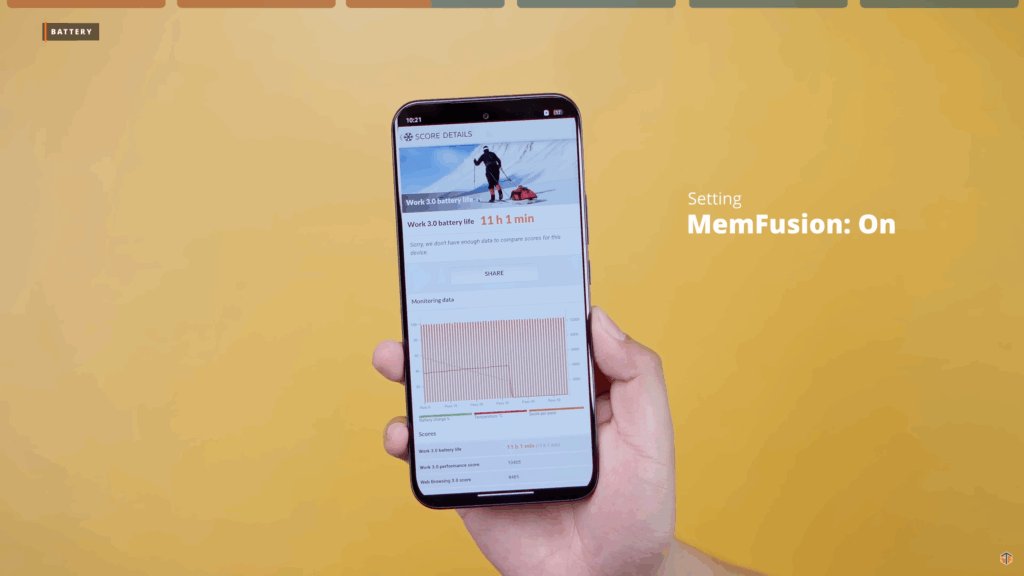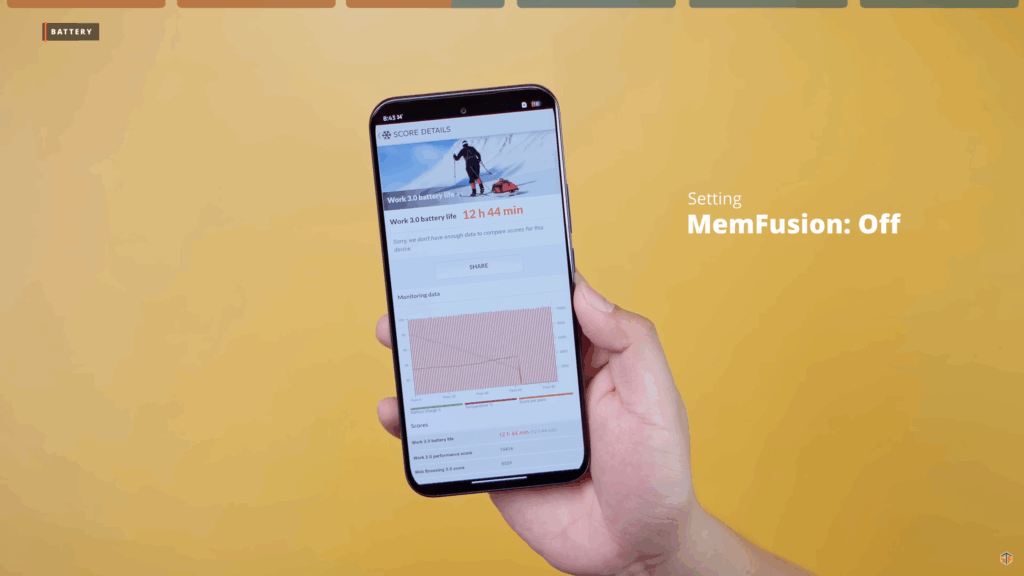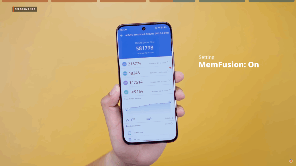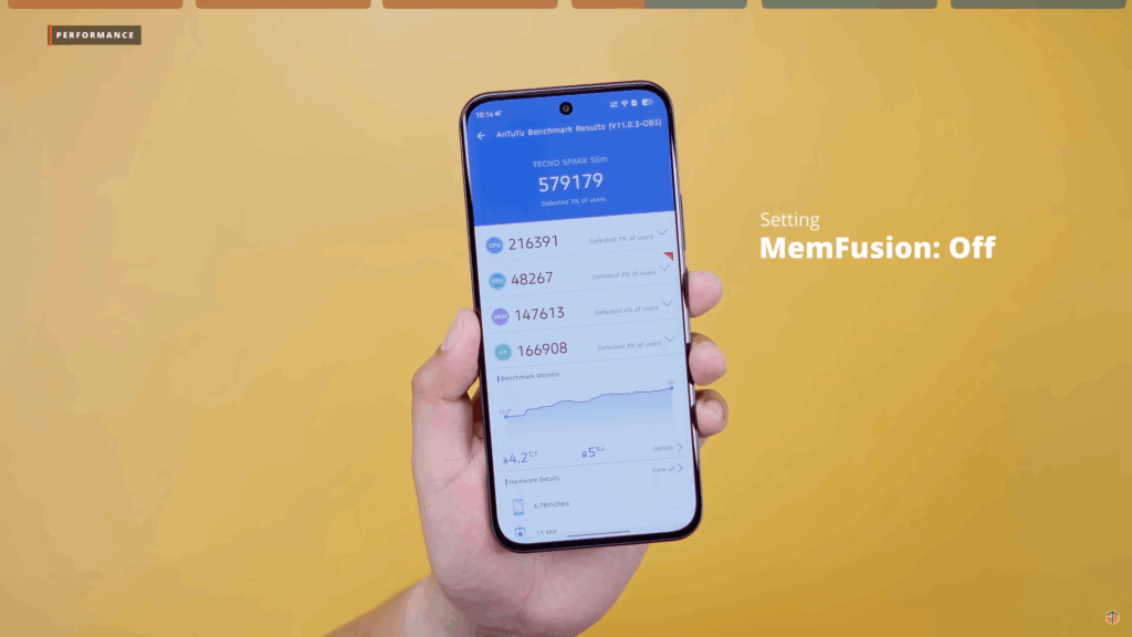 Again, meron itong MemFusion na up to 8GB. Pwedeng umabot ng 16GB yung RAM. Pero kung sa battery ay malaki-laki ‘yung impact ng MemFusion. Medyo nabawasan ‘yung SOT. Pagdating kaya sa performance ay may maitutulong talaga ‘yung MemFusion. Ang AnTuTu kapag naka-off ‘yung MemFusion ay 579179. Kapag naka-on ay tumaas ito, 581798. Kung gagamit tayo ng virtual RAM ay medyo bababa yung battery performance. Pero pagdating sa overall performance ng phone ay mas magiging okay naman.