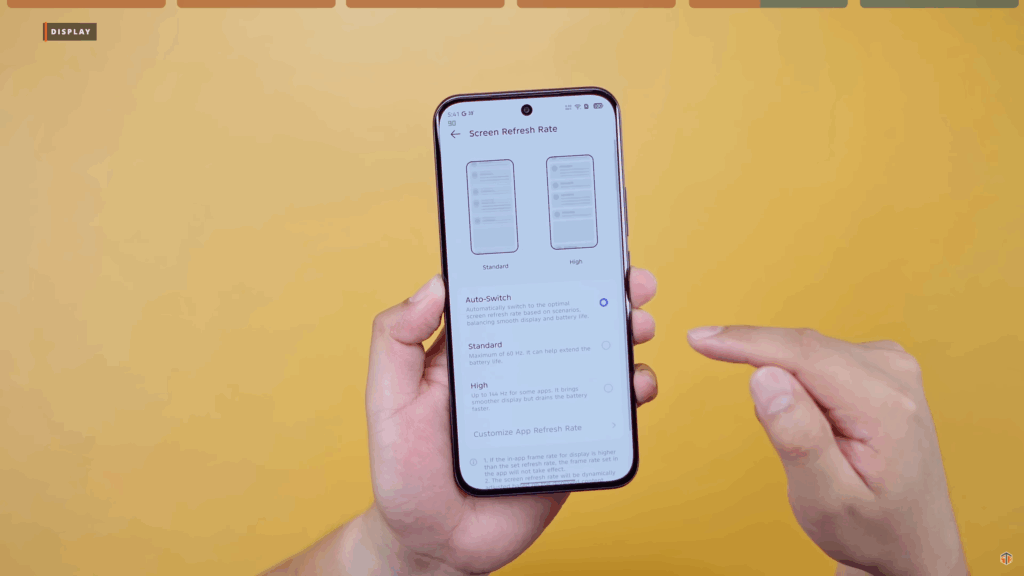 Sa display settings at screen refresh rate. Kapag naka-Auto Switch, maglalaro lang ito to 90Hz at bababa to 60Hz kung hindi na ginagalaw ‘yung display. Kapag Standard ay fix 60Hz. Sa High ay pwedeng ma-utilize yung 144Hz na refresh rate. Pwedeng i-customize yung application na pwedeng gumamit ng 144Hz. Sa test ko, tatlo lang ang may support sa 144Hz. The rest, ang pinakamataas ay 120Hz. Sa Test UFO, pumalo ito ng 120Hz. Hindi pa natin magagamit ng husto yung 144Hz at for future proofing pa lang.