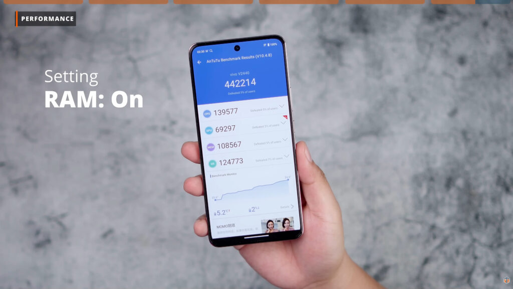 At kagaya ng kuya nito na vivo V50 5G, itong vivo V50 Lite ay aabot din ng Android 18. Sabi ng vivo, up to 3 Major Android Upgrades yung matatanggap nito. Pwede pa ring gamitin yung extended RAM nito pero naka-fix ito to 8GB. On top of 8GB na physical RAM, pwede pa itong madagdagan ng additional 8GB na virtual RAM. Ang nakuhang AnTuTu score kapag hindi ginamit ‘yung virtual RAM or extended RAM ay 438849. At kapansin-pansin naman na tumaas ng kaunti nung ginamit yung virtual RAM, 442214. Kung kailangan ninyo ng additional RAM, hindi kayo mag-aalala na babagal yung performance kapag ginamit yung extended RAM. Sa result ng Wild Life Stress Test, yung battery nito ay nabawasan lang ng 1% at nadagdagan lang ng 5°C.