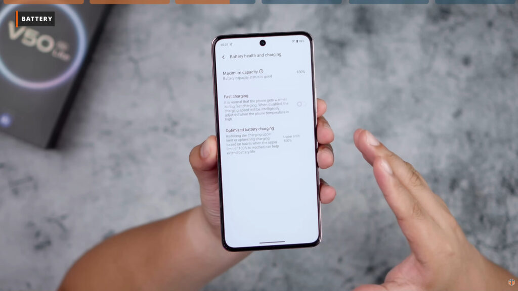 Sa charging, 18% to 100% ay 56 minutes ko lang na-charge ‘yung phone na ‘to. Considering na 6500mAh iyung capacity nito. Yung charging speed na iyan ay mabilis talaga. Ang maganda sa battery setting, binigyan tayo ng vivo ng option kung gusto nating gamitin palagi yung fast charging. Kung hindi naman natin kailangan ng palaging mabilis na pag-charge. Halimbawa, icha-charge itong phone habang natutulog tayo, huwag na nating i-enable. Maaalagaan pa natin iyung battery health ng vivo V50 Lite. Makikita rin natin iyung maximum capacity. Mamo-monitor natin kung kailangan na ba nating palitan yung battery nito. At if ever na kailangan natin itong ipamana sa iba. Pwede nating ipakita sa kanila na okay na okay pa yung battery health.