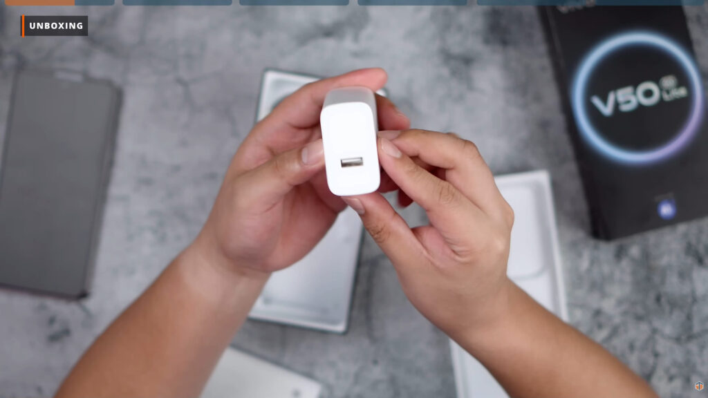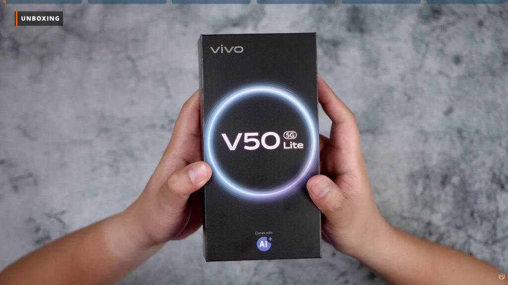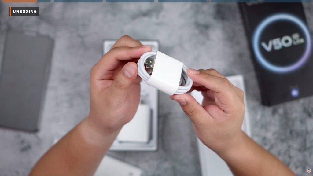 Sa box ng vivo V50 Lite 5G ay may text na Comes with AI. Wala namang makitang kakaiba sa box ng phone. Pag-open, unang makikita ay yung mismong phone na nakabalot. Sa ilalim ay merong jelly case na makapal-kapal. Merong documentations, 90W na charging brick na USB-A yung port, USB-C to USB-C cable, at SIM ejector pin. Nanditong color way ay Titanium Gold. Sobrang ganda rin at napakalinis tingnan.
