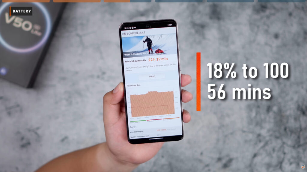 Pag-usapan natin yung isa sa main highlight nitong vivo V50 Lite. At yan yung battery performance nito. 6500mAh lang naman yung capacity ng phone at 90W yung charging speed. So far ha, spoiler lang, ito yung may pinakamataas na screen on time ngayong 2025. Yet. Sa lahat ng mga phones na-test ko so far, ito yung may pinakamataas na SOT. Tingnan nyo naman yung SOT ng phone na ito, 22 hours and 19 minutes. Ang tindi! Almost 24 hours na bukas ay pwede ‘tong phone na ‘to. Ang tindi, ‘di ba? Hindi tayo mapupwersa na i-charge agad-agad itong vivo V50 Lite. Hindi ito ganon kabilis ma-lowbat kaya hindi madaling made-degrade yung battery. Kaya matagal nating magagamit itong phone na ‘to.