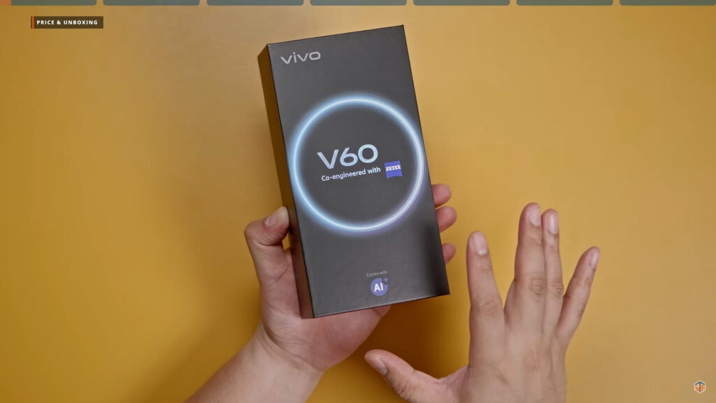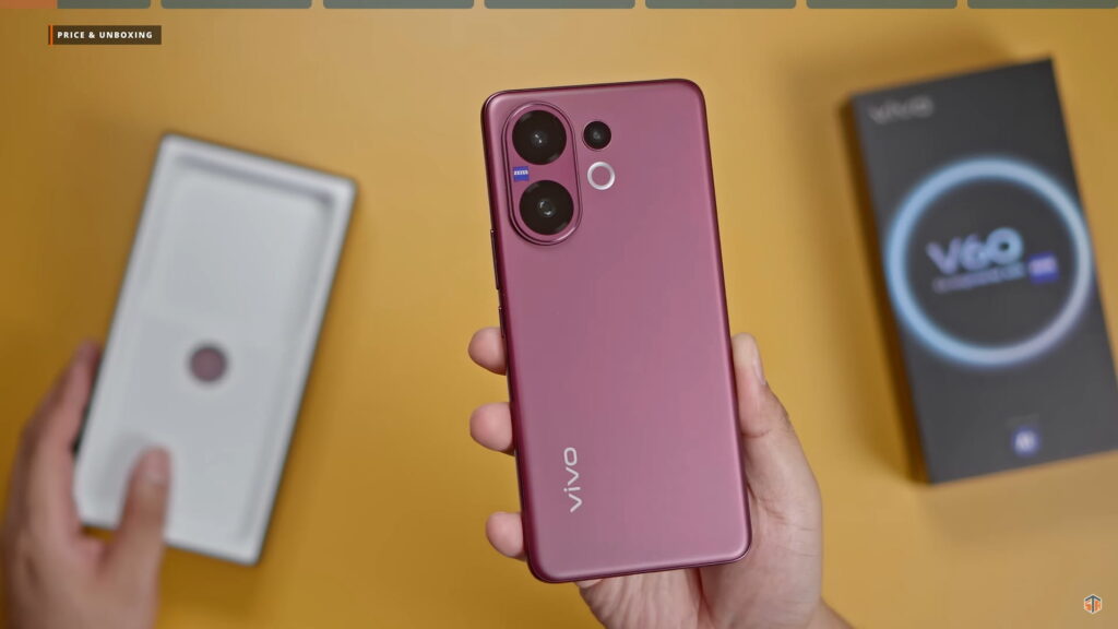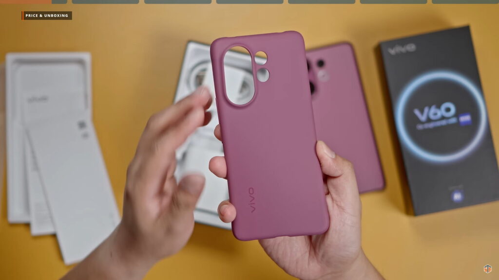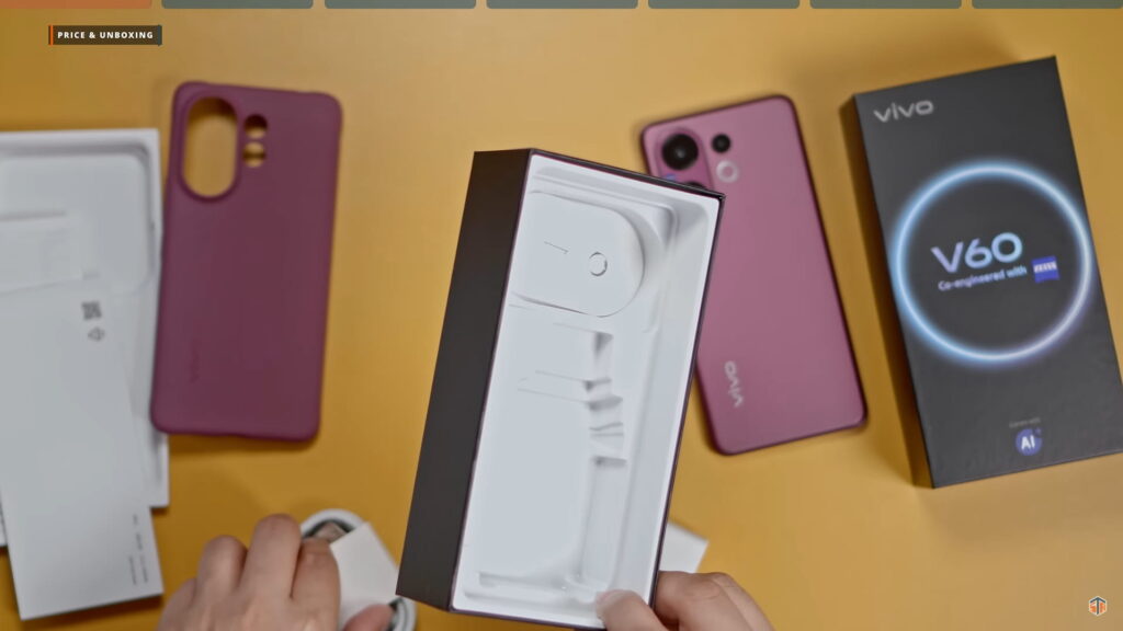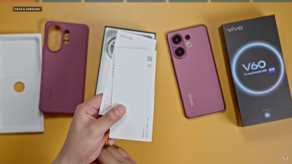 Disclaimer lang, nagamit ko na ‘yung phone na ‘to. Binalik ko lang sa box para maipakita ulit ‘yung unboxing experience. Kasi nung dumating sa akin ‘to ay sobrang na-excite ako. Gustong-gusto ko na agad itong i-test at gamitin. Ganun pa rin naman, wala naman masyadong difference pagdating sa itsura ng box. May V60 co-engineered with ZEISS pa rin. Pag-open, yung phone agad yung makikita. Yung color na nandito ay yung Berry Purple. Sobrang ganda, grabe! Napakaelegante ng itsura. Nakakatuwa yung Vivo. Hindi sila takot na gawing colorway ito sa kanilang V series. Kapag ganitong mga shade ng color ay parang default na pambabae yan pero hindi eh. Pwede siyang panglalaki rin.