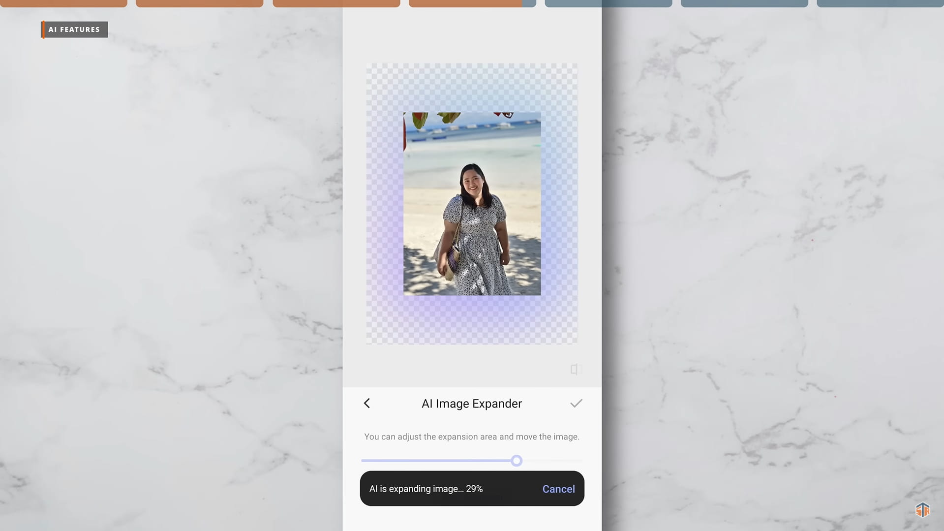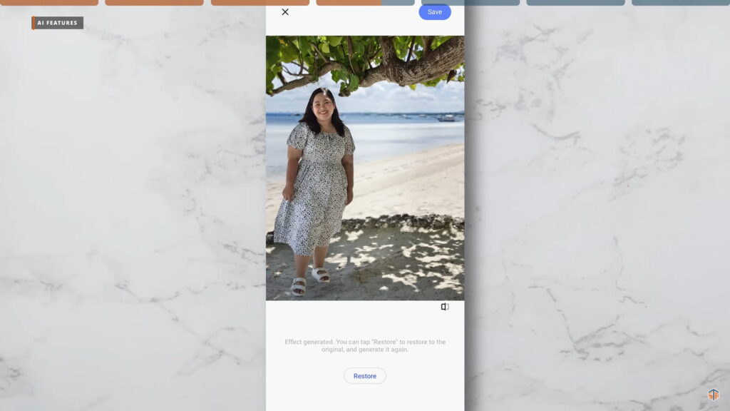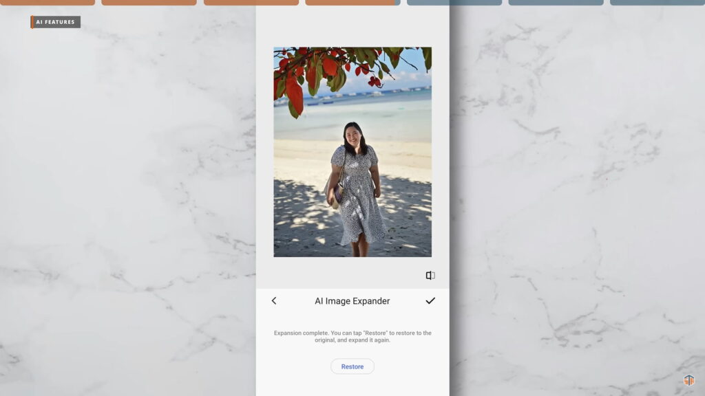 Yung pangatlo naman ay yung AI Image Expander. Kung medyo kinapos ng background ay pwedeng gamitin ito. Piliin ulit ‘yung image sa Gallery > edit > framing > tapos AI Image Expander. M-move lang ‘yung bar kung gaano kalaking pag-expand yung gusto nating gawin. Malinis ulit. Reminder lang na lahat ng AI features na ‘to ay napaka-useful. Pero kailangan ng data connection or internet.