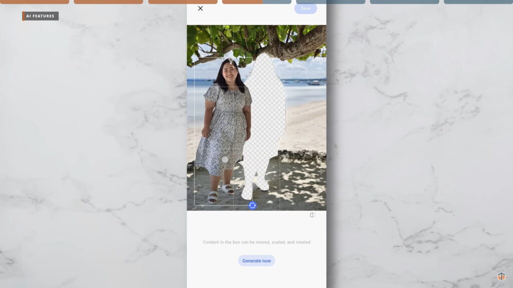 Sunod naman ay yung AI Magic Move. Kung gusto nating i-move ng kaunti yung location ng subject sa photo. Punta lang sa Gallery > select yung photo > i-long press yung subject. Auto detect na yan ng AI. May lalabas na menu. Select lang natin yung AI Magic Move. Pwede nang i-move ng kaunti yung subject. Click lang ang generate at hintayin matapos. Yung result ay napakalinis at hindi halata.