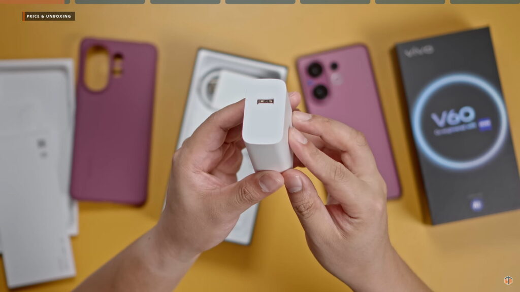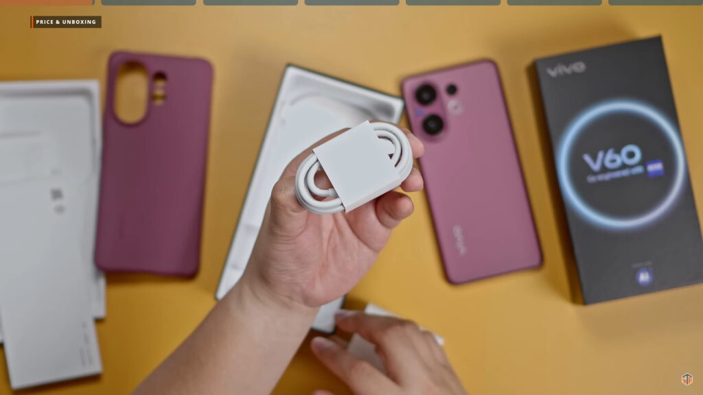 Sobrang ganda ng kulay. Matte rin yung likod at may vivo branding sa baba. May ZEISS logo sa may camera module. Sa loob ng box ay may case. ‘Yung case ay kakulay ng phone. Ang galing. ‘Yan ‘yung isa sa mga nakakasira sa itsura ng likod ng phone. Kapag hindi nagra-rhyme ‘yung itsura ng case sa likod ng phone. Itong case ay kakulay tapos matte din. Very good at thumbs up sa vivo. Meron din itong mga documentation, 90W charger na USB-A pa rin yung port, USB-A to USB-C cable, at SIM ejector pin.
