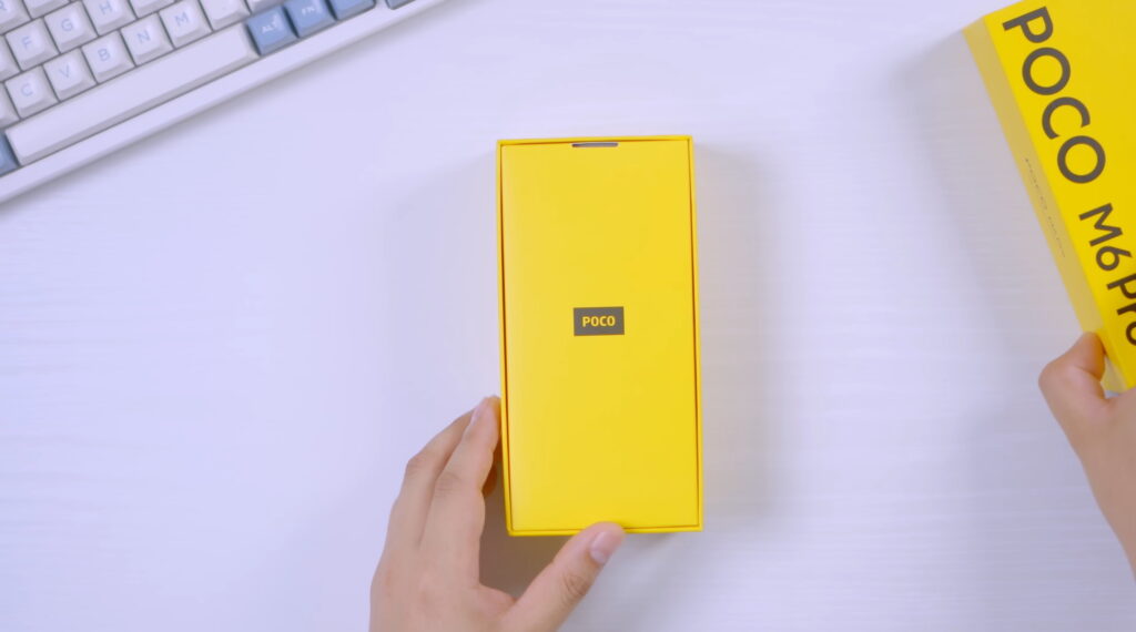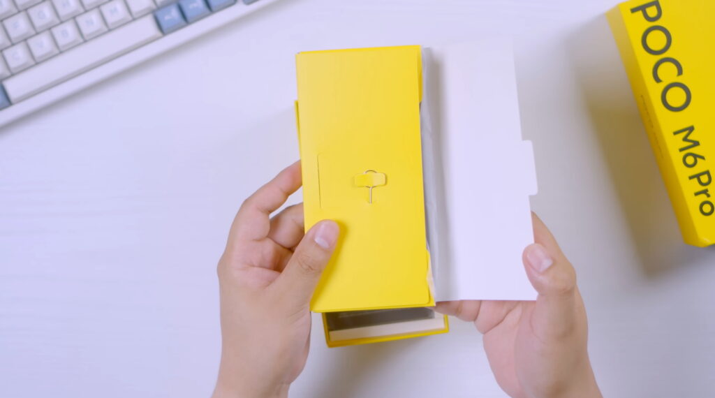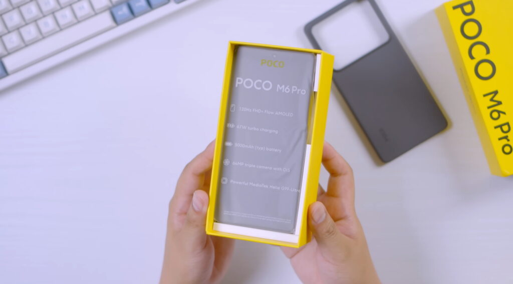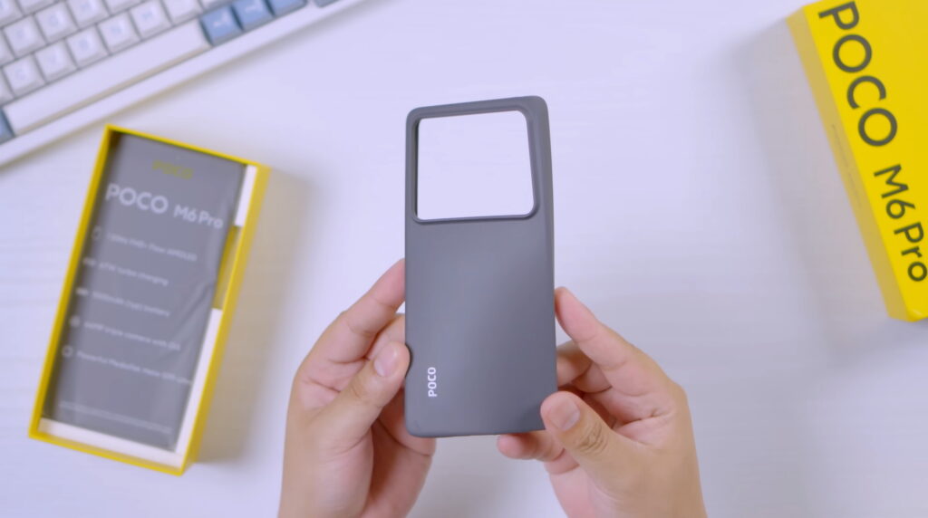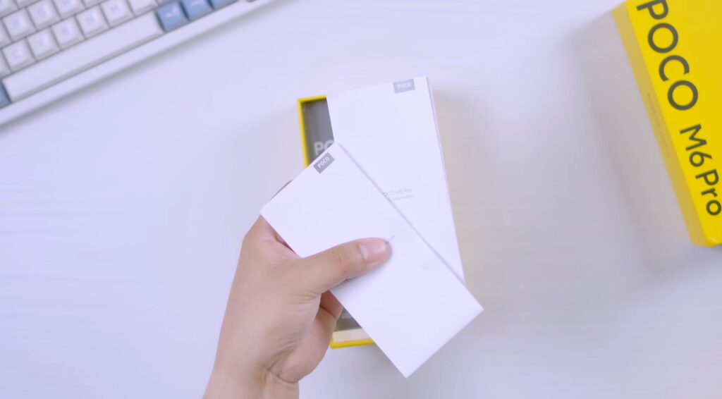 Yellow pa rin ang box ng phone. Pinadala sa atin ay ang 8/256GB na variant at Blue na colorway, pero may Black at Purple rin. Pag-open ng box, ang unang bubungad sa atin ay document sleeve. Sa loob ng document sleeve ang SIM ejector pin, documentations, at case na kahawig sa Redmi Note 13. Sa likod ng sleeve ang M6 Pro na nakabalot ng printed plastic. Sa ilalim ng box ang 67W na charging brick at USB-C to USB-A cable. Kapag may case ay expose na expose ang buong camera module. Okay naman ang case pero I suggest bili kayo ng mas magandang case.